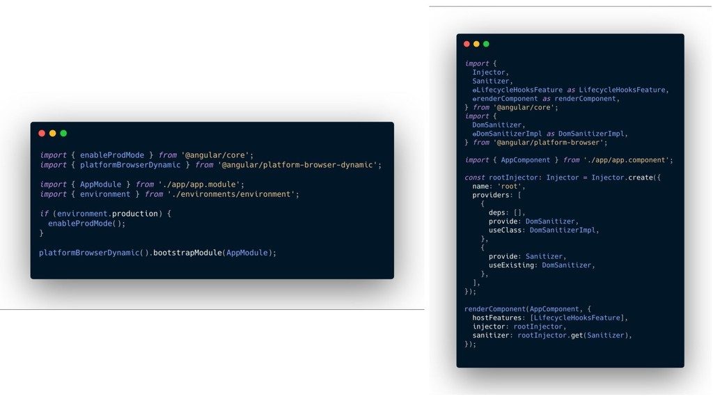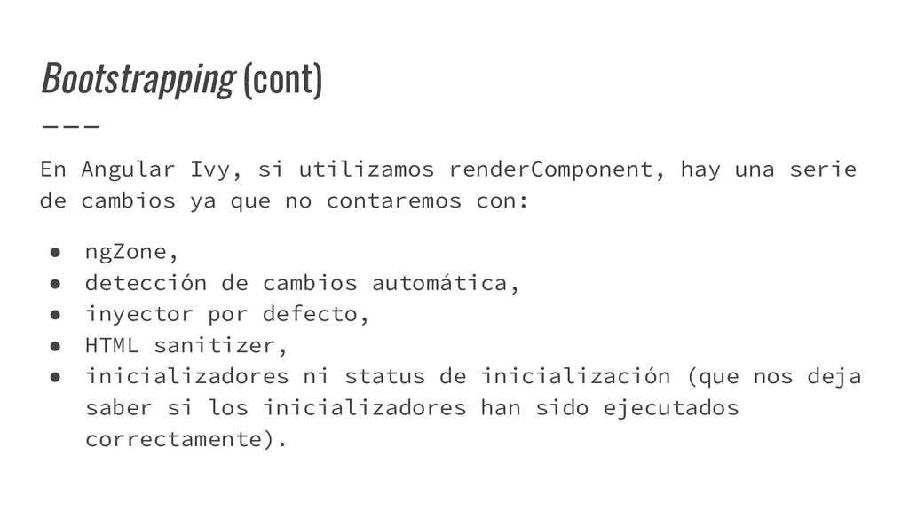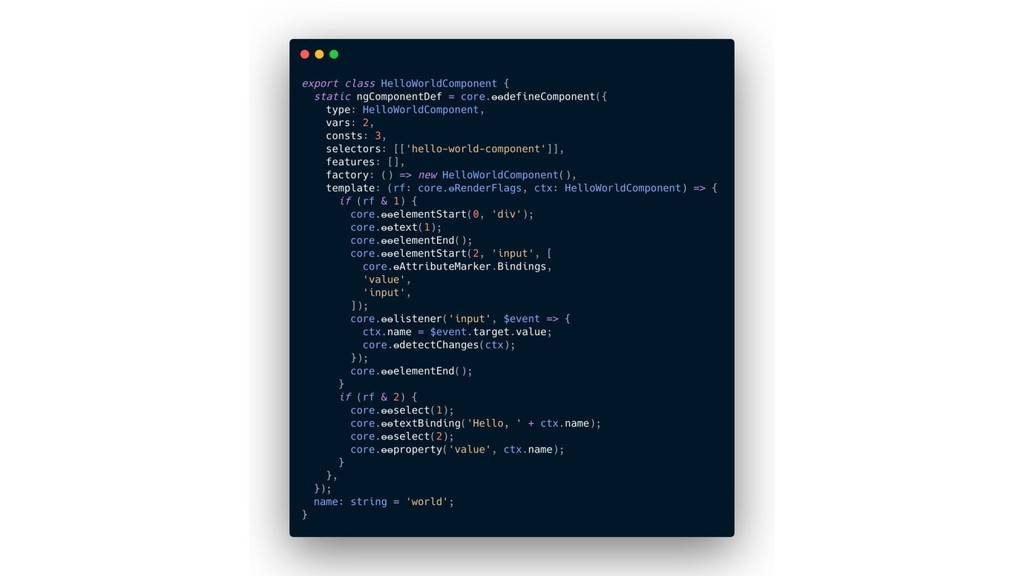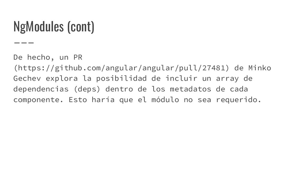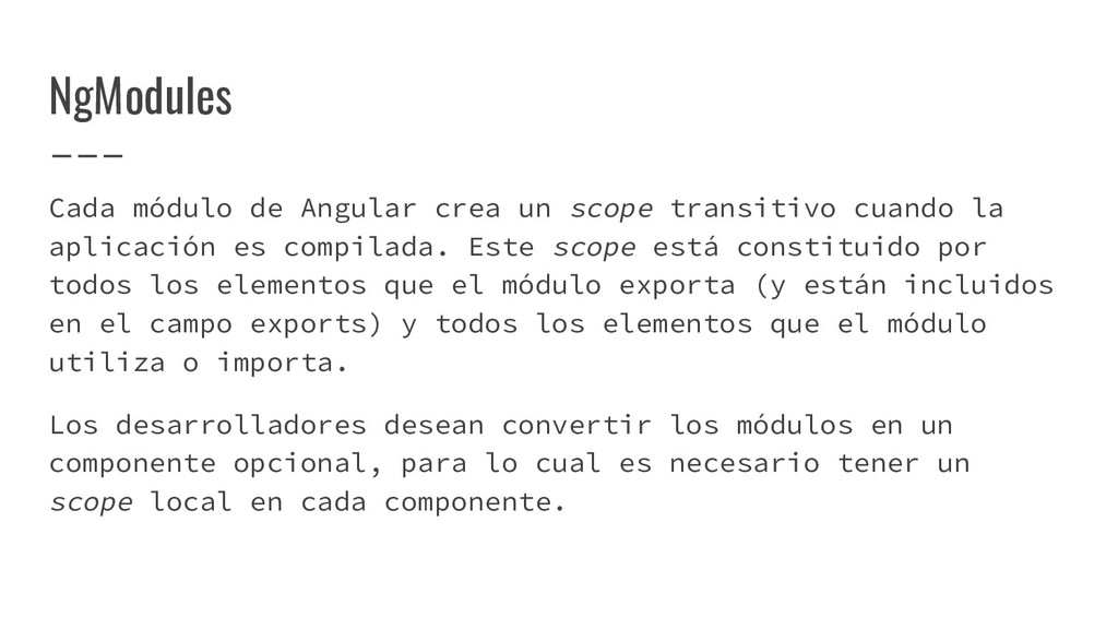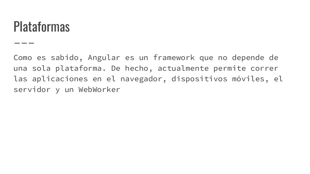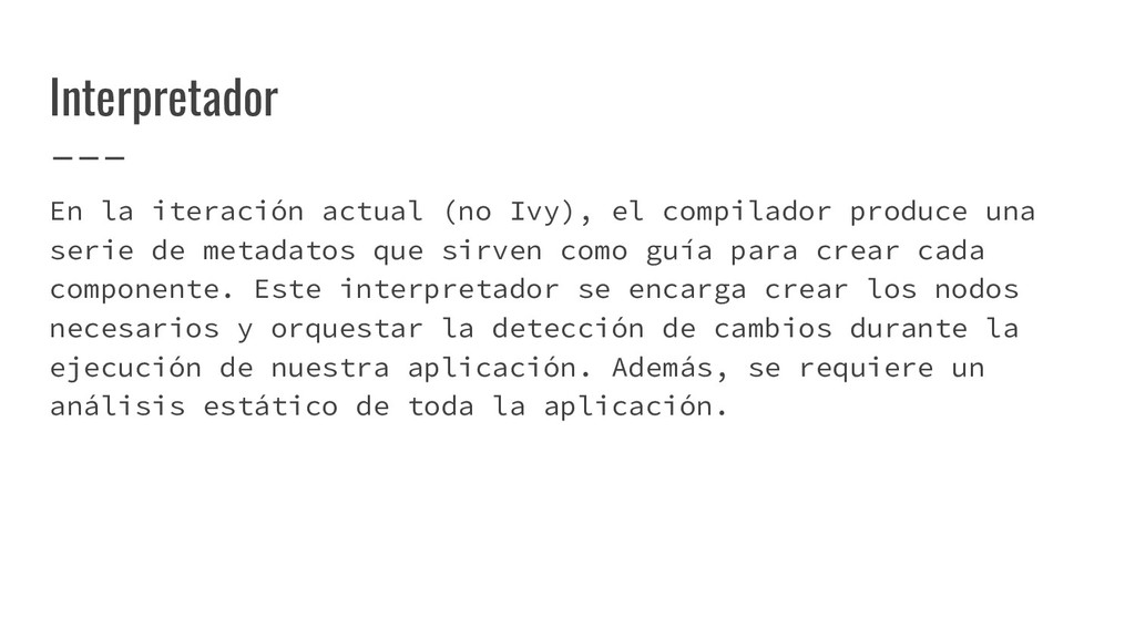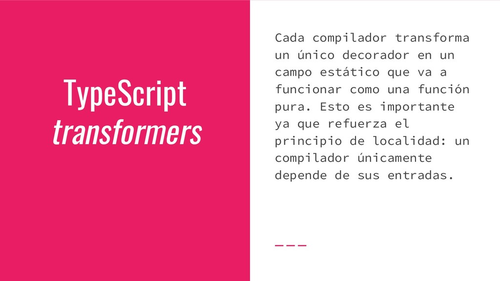 y convertirlo en un AST de HTML que, a su vez, se convierte en un Angular Template AST. Este último es una forma especial de AST que contiene partes exclusivas de Angular: se encarga de convertir la sintaxis especial a su versión canónica, recolectar todas las referencias y variables, y crear los bindings necesarios. Compilación de templates (cont)