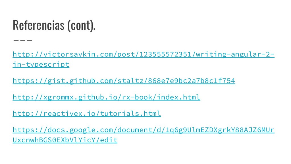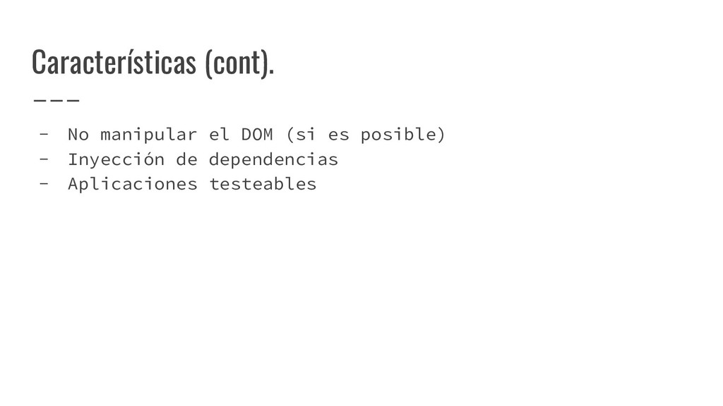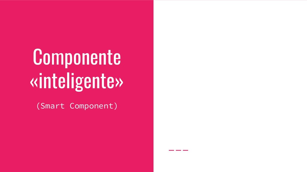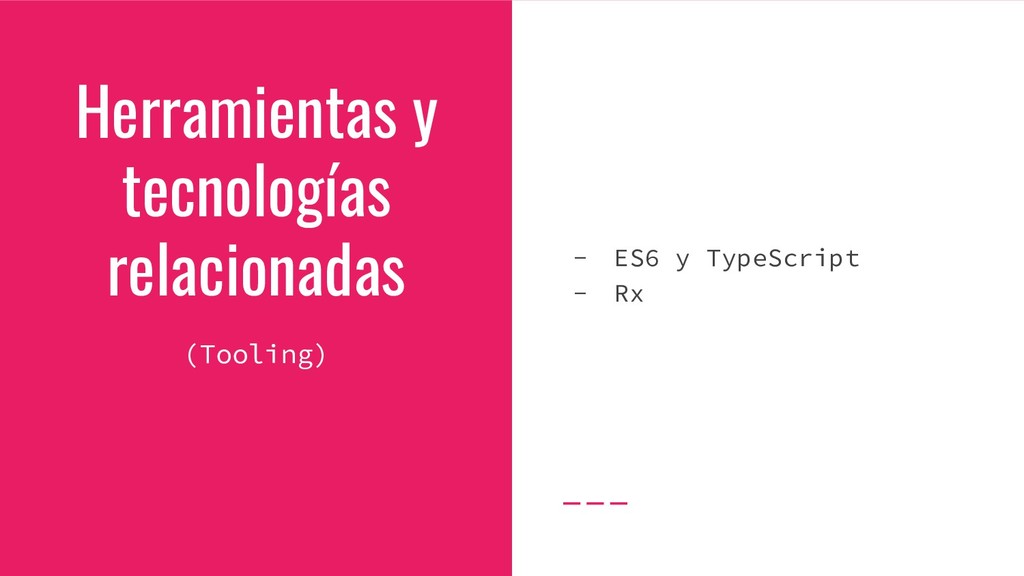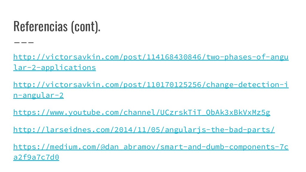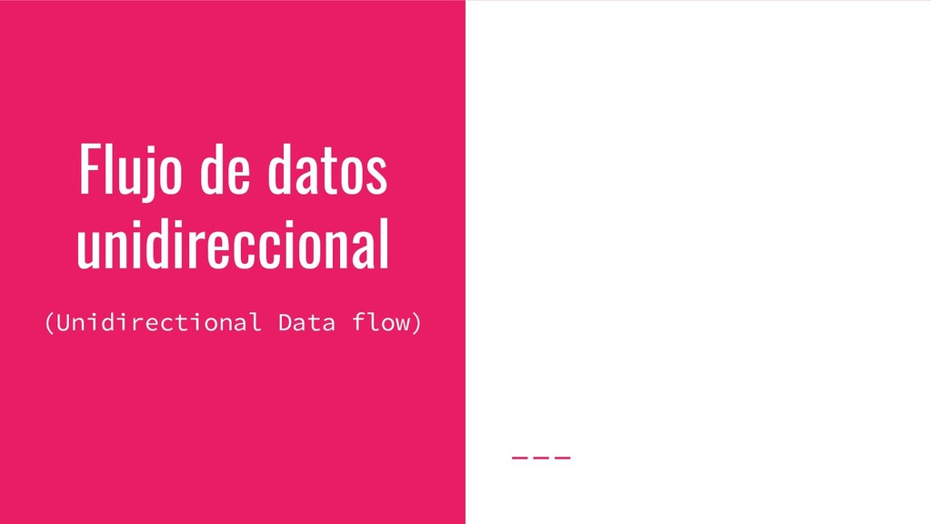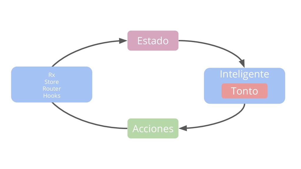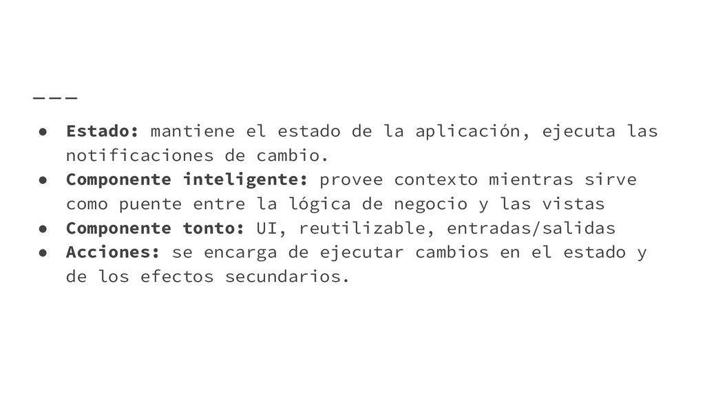 notificaciones de cambio. • Componente inteligente: provee contexto mientras sirve como puente entre la lógica de negocio y las vistas • Componente tonto: UI, reutilizable, entradas/salidas • Acciones: se encarga de ejecutar cambios en el estado y de los efectos secundarios.