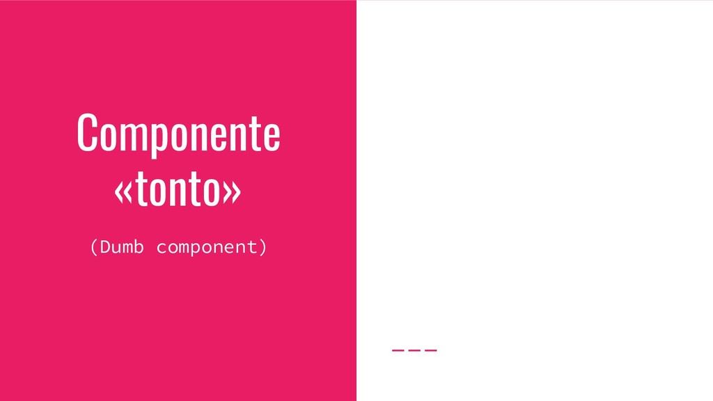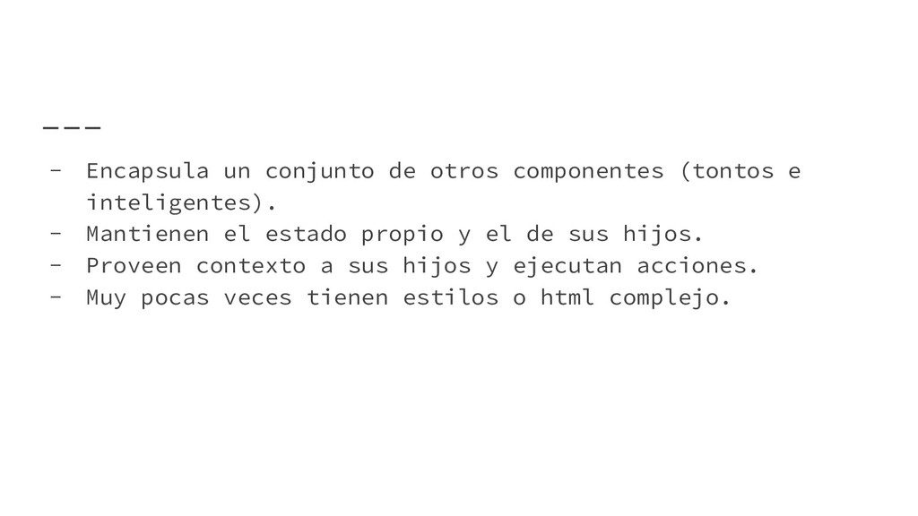 - Recibe los datos y el contexto de otro componente. - Tiene CSS asociado. - Muy pocas veces contiene su propio estado. - Puede utilizar o contener otros componentes tontos. - Se pueden utilizar para hacer layout.