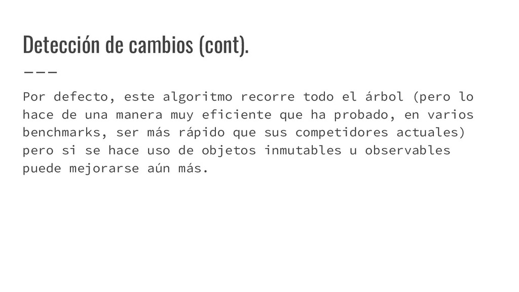 el árbol (pero lo hace de una manera muy eficiente que ha probado, en varios benchmarks, ser más rápido que sus competidores actuales) pero si se hace uso de objetos inmutables u observables puede mejorarse aún más.