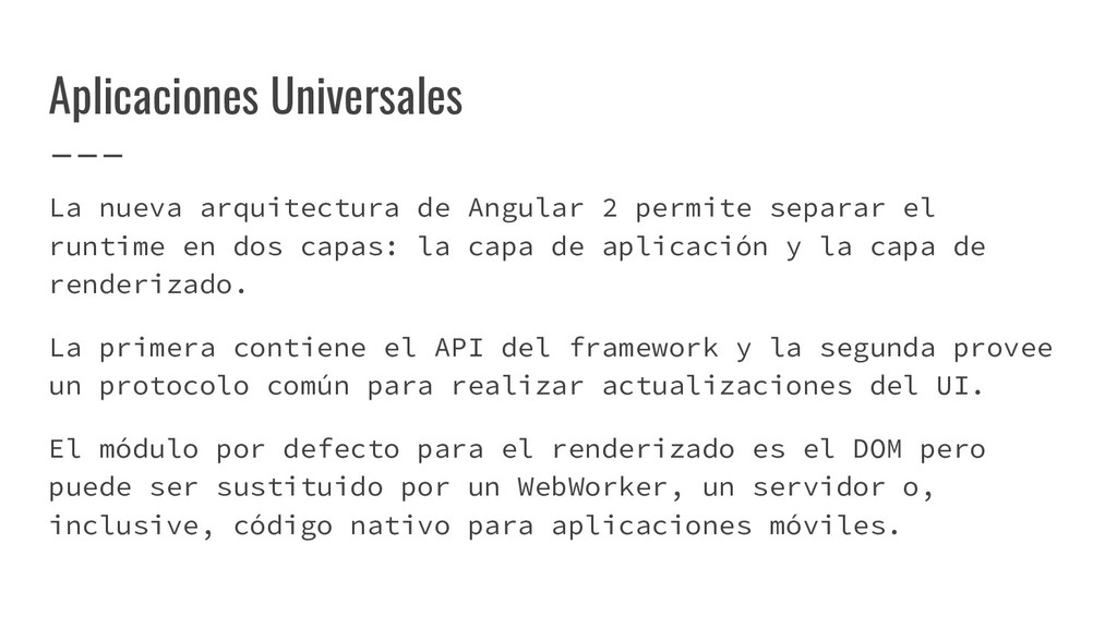 el runtime en dos capas: la capa de aplicación y la capa de renderizado. La primera contiene el API del framework y la segunda provee un protocolo común para realizar actualizaciones del UI. El módulo por defecto para el renderizado es el DOM pero puede ser sustituido por un WebWorker, un servidor o, inclusive, código nativo para aplicaciones móviles.