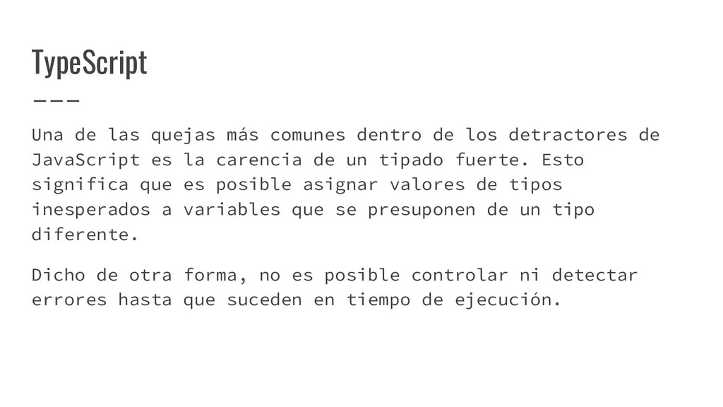 detractores de JavaScript es la carencia de un tipado fuerte. Esto significa que es posible asignar valores de tipos inesperados a variables que se presuponen de un tipo diferente. Dicho de otra forma, no es posible controlar ni detectar errores hasta que suceden en tiempo de ejecución.
