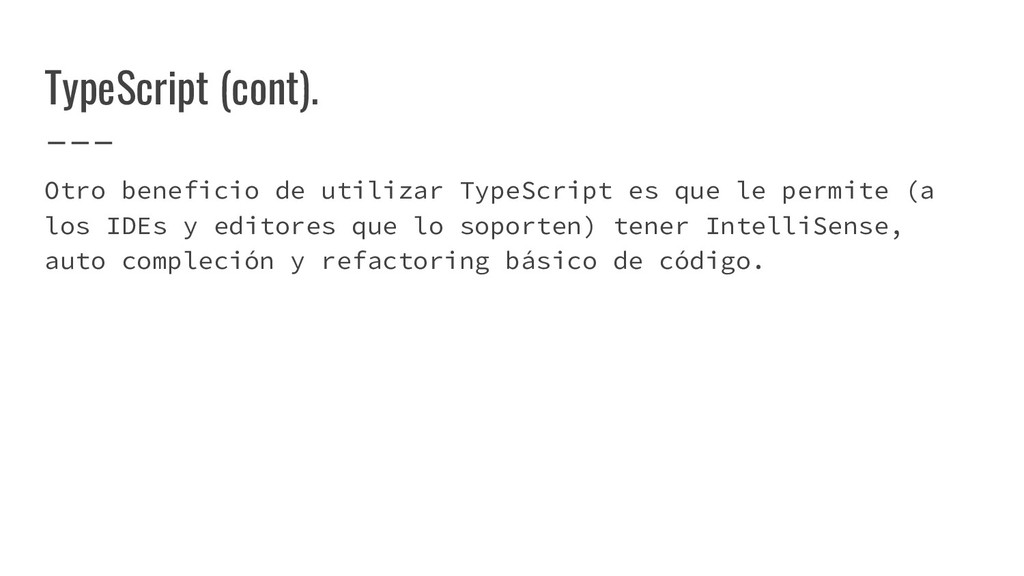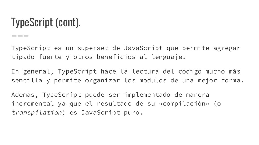 agregar tipado fuerte y otros beneficios al lenguaje. En general, TypeScript hace la lectura del código mucho más sencilla y permite organizar los módulos de una mejor forma. Además, TypeScript puede ser implementado de manera incremental ya que el resultado de su «compilación» (o transpilation) es JavaScript puro.
