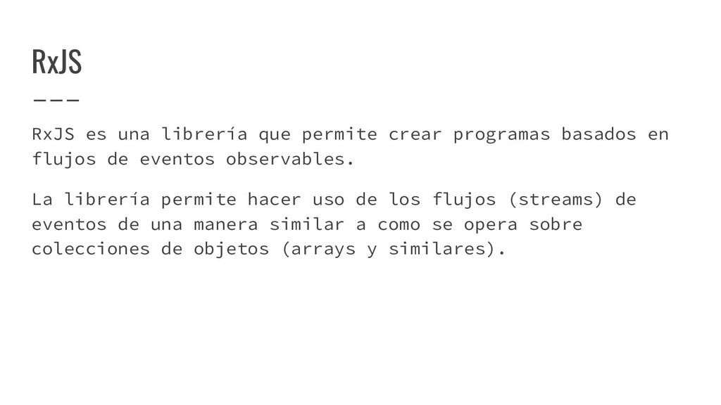 en flujos de eventos observables. La librería permite hacer uso de los flujos (streams) de eventos de una manera similar a como se opera sobre colecciones de objetos (arrays y similares).
