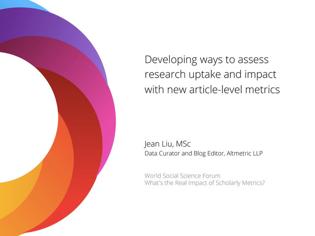 article-level metrics Jean Liu, MSc Data Curator and Blog Editor, Altmetric LLP World Social Science Forum What's the Real Impact of Scholarly Metrics?