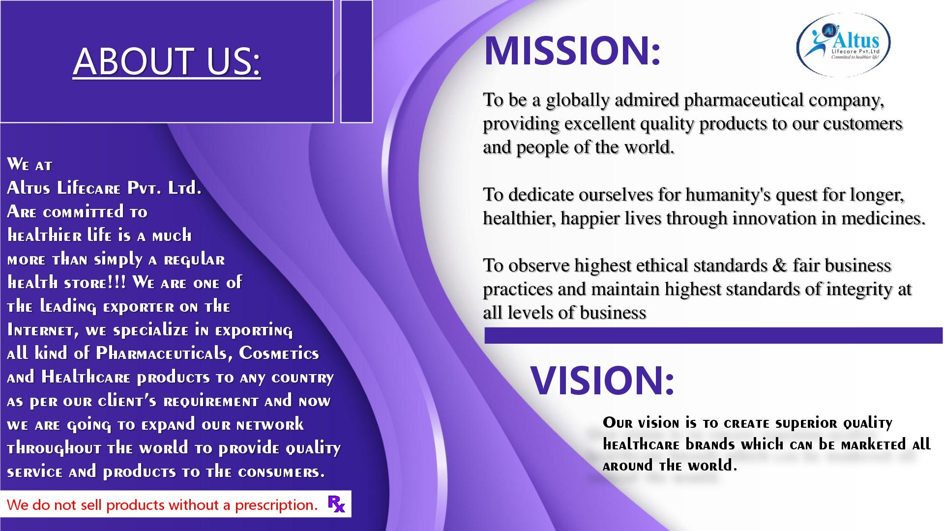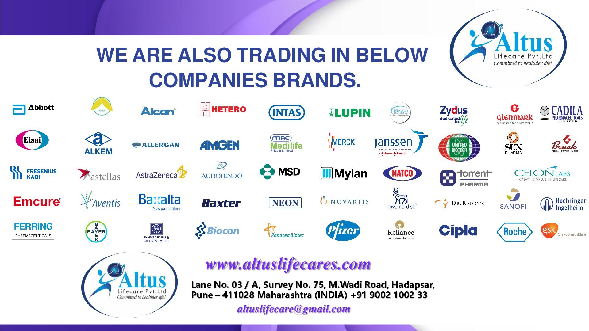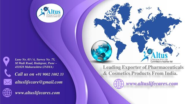 We at Altus LifeCare Pvt. Ltd. Are committed to healthier life is a much more than simply a regular health store!!! We are one of the leading exporter on the Internet, we specialize in exporting all kind of Pharmaceuticals, Cosmetics and Healthcare products to any country as per our client’s requirement and now we are going to expand our network throughout the world to provide quality service and products to the consumers.