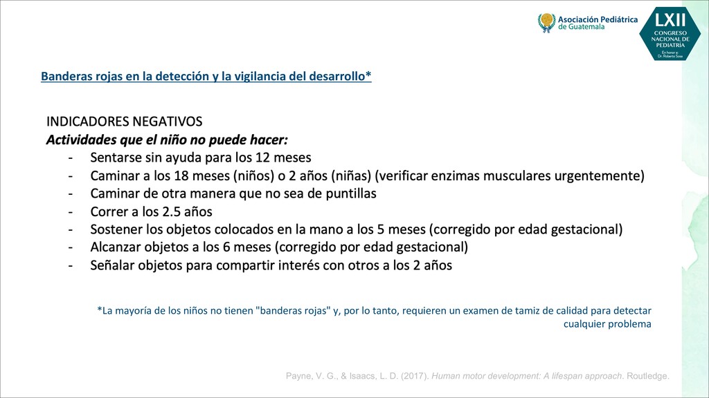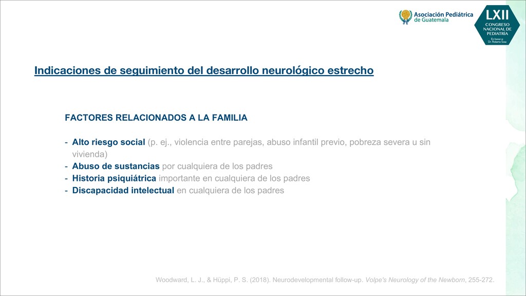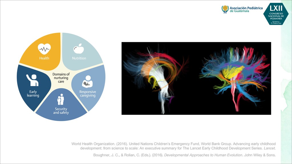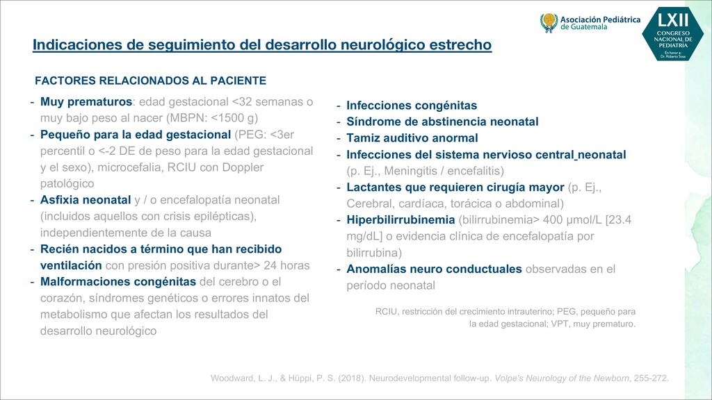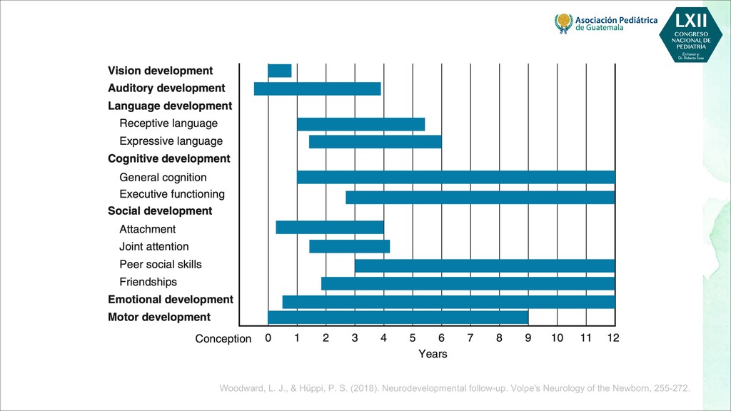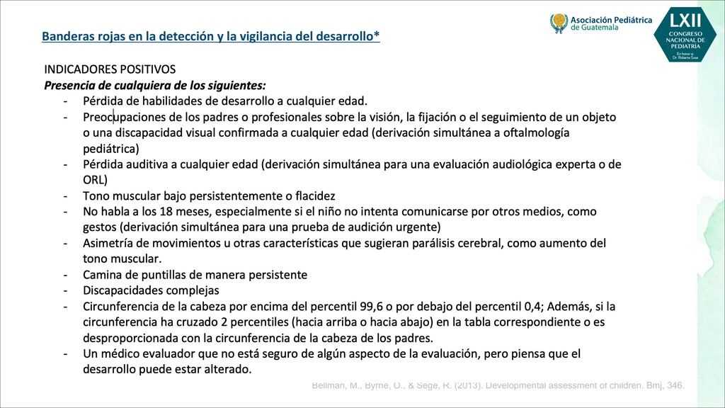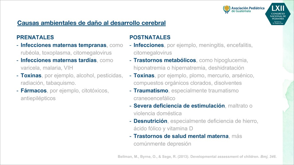 maternas tempranas, como rubéola, toxoplasma, citomegalovirus - Infecciones maternas tardías, como varicela, malaria, VIH - Toxinas, por ejemplo, alcohol, pesticidas, radiación, tabaquismo. - Fármacos, por ejemplo, citotóxicos, antiepilépticos POSTNATALES - Infecciones, por ejemplo, meningitis, encefalitis, citomegalovirus - Trastornos metabólicos, como hipoglucemia, hiponatremia o hipernatremia, deshidratación - Toxinas, por ejemplo, plomo, mercurio, arsénico, compuestos orgánicos clorados, disolventes - Traumatismo, especialmente traumatismo craneoencefálico - Severa deficiencia de estimulación, maltrato o violencia doméstica - Desnutrición, especialmente deficiencia de hierro, ácido fólico y vitamina D - Trastornos de salud mental materna, más comúnmente depresión Bellman, M., Byrne, O., & Sege, R. (2013). Developmental assessment of children. Bmj, 346.