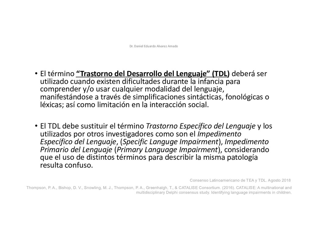 ser utilizado cuando existen dificultades durante la infancia para comprender y/o usar cualquier modalidad del lenguaje, manifestándose a través de simplificaciones sintácticas, fonológicas o léxicas; así como limitación en la interacción social. • El TDL debe sustituir el término Trastorno Específico del Lenguaje y los utilizados por otros investigadores como son el Impedimento Específico del Lenguaje, (Specific Languge Impairment), Impedimento Primario del Lenguaje (Primary Language Impairment), considerando que el uso de distintos términos para describir la misma patología resulta confuso. Consenso Latinoamericano de TEA y TDL. Agosto 2018 Thompson, P. A., Bishop, D. V., Snowling, M. J., Thompson, P. A., Greenhalgh, T., & CATALISE Consortium. (2016). CATALISE: A multinational and multidisciplinary Delphi consensus study. Identifying language impairments in children. Dr. Daniel Eduardo Alvarez Amado
