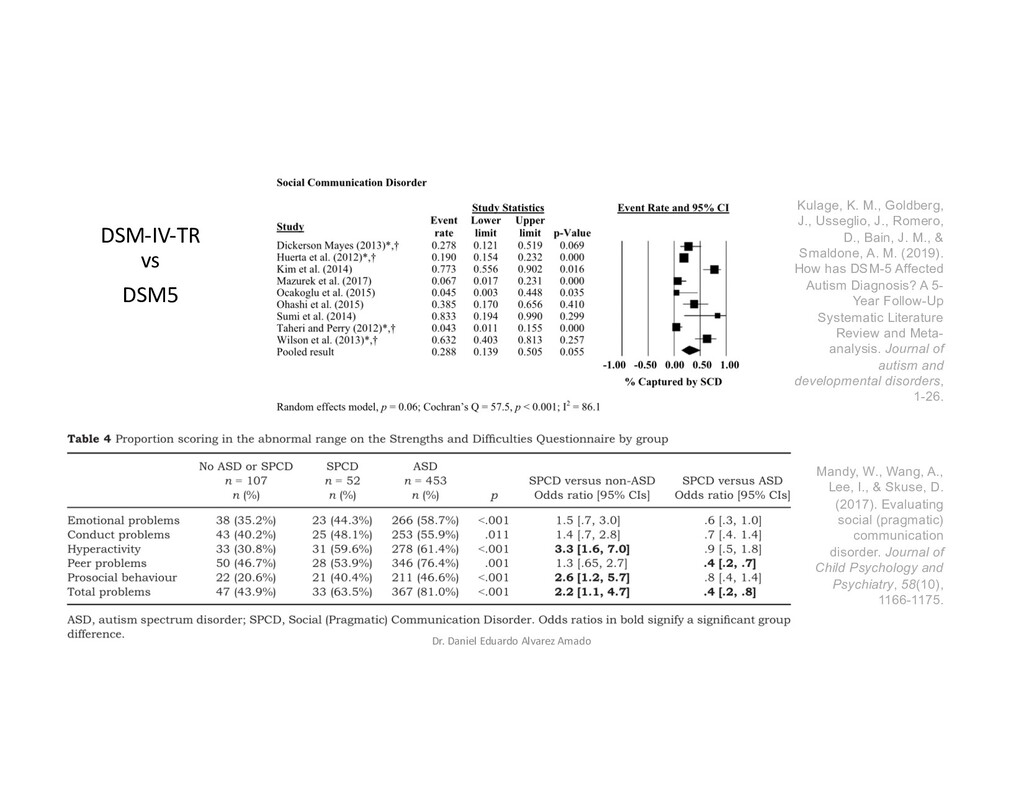 Romero, D., Bain, J. M., & Smaldone, A. M. (2019). How has DSM-5 Affected Autism Diagnosis? A 5- Year Follow-Up Systematic Literature Review and Meta- analysis. Journal of autism and developmental disorders, 1-26. Mandy, W., Wang, A., Lee, I., & Skuse, D. (2017). Evaluating social (pragmatic) communication disorder. Journal of Child Psychology and Psychiatry, 58(10), 1166-1175. Dr. Daniel Eduardo Alvarez Amado