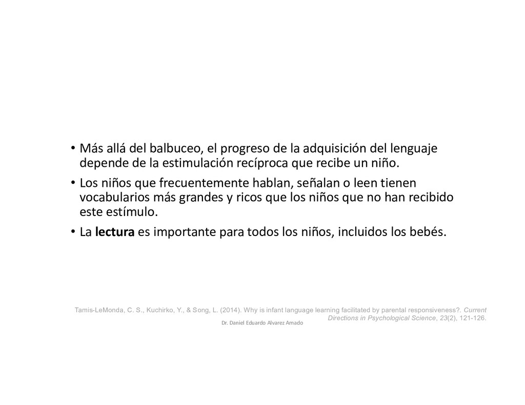 del lenguaje depende de la estimulación recíproca que recibe un niño. • Los niños que frecuentemente hablan, señalan o leen tienen vocabularios más grandes y ricos que los niños que no han recibido este estímulo. • La lectura es importante para todos los niños, incluidos los bebés. Tamis-LeMonda, C. S., Kuchirko, Y., & Song, L. (2014). Why is infant language learning facilitated by parental responsiveness?. Current Directions in Psychological Science, 23(2), 121-126. Dr. Daniel Eduardo Alvarez Amado