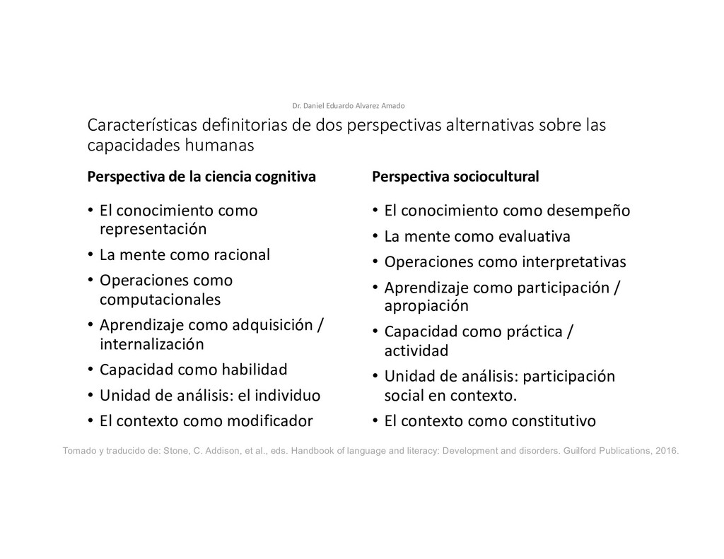 • La mente como racional • Operaciones como computacionales • Aprendizaje como adquisición / internalización • Capacidad como habilidad • Unidad de análisis: el individuo • El contexto como modificador Perspectiva sociocultural • El conocimiento como desempeño • La mente como evaluativa • Operaciones como interpretativas • Aprendizaje como participación / apropiación • Capacidad como práctica / actividad • Unidad de análisis: participación social en contexto. • El contexto como constitutivo Características definitorias de dos perspectivas alternativas sobre las capacidades humanas Tomado y traducido de: Stone, C. Addison, et al., eds. Handbook of language and literacy: Development and disorders. Guilford Publications, 2016. Dr. Daniel Eduardo Alvarez Amado