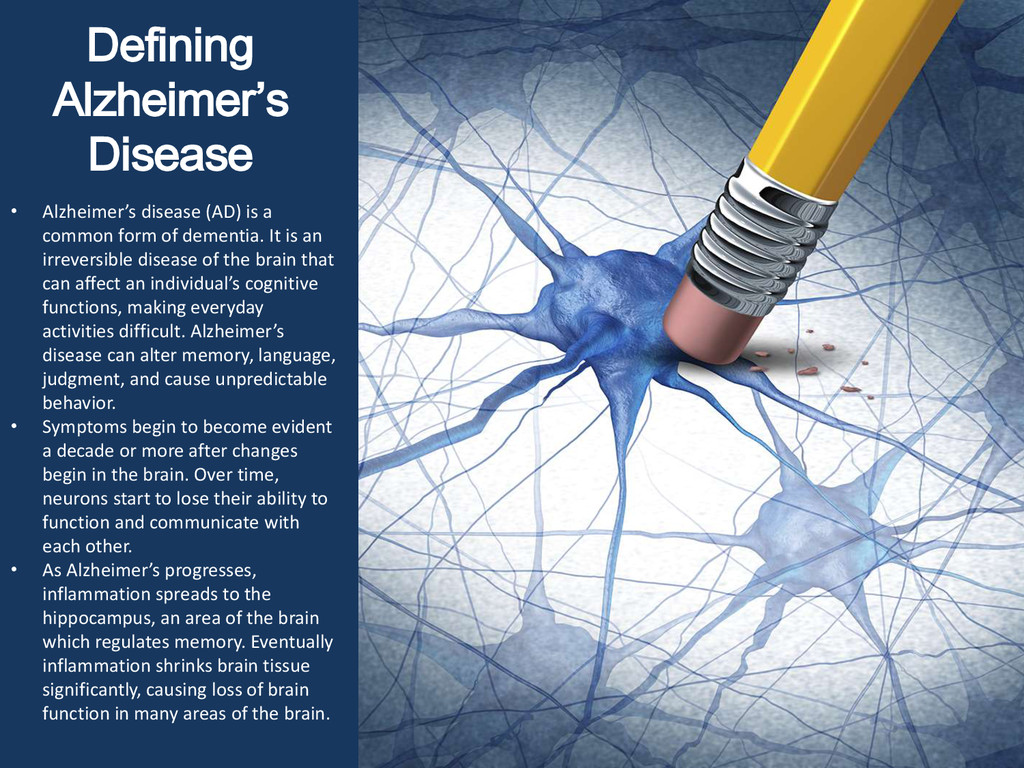 form of dementia. It is an irreversible disease of the brain that can affect an individual’s cognitive functions, making everyday activities difficult. Alzheimer’s disease can alter memory, language, judgment, and cause unpredictable behavior. • Symptoms begin to become evident a decade or more after changes begin in the brain. Over time, neurons start to lose their ability to function and communicate with each other. • As Alzheimer’s progresses, inflammation spreads to the hippocampus, an area of the brain which regulates memory. Eventually inflammation shrinks brain tissue significantly, causing loss of brain function in many areas of the brain.