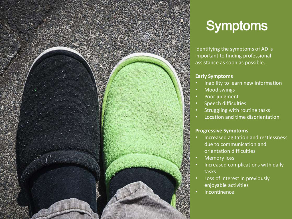 professional assistance as soon as possible. Early Symptoms • Inability to learn new information • Mood swings • Poor judgment • Speech difficulties • Struggling with routine tasks • Location and time disorientation Progressive Symptoms • Increased agitation and restlessness due to communication and orientation difficulties • Memory loss • Increased complications with daily tasks • Loss of interest in previously enjoyable activities • Incontinence