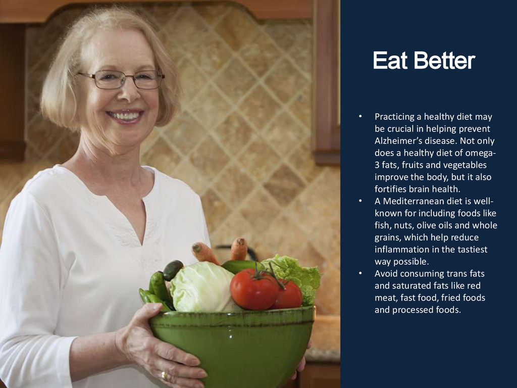 in helping prevent Alzheimer’s disease. Not only does a healthy diet of omega- 3 fats, fruits and vegetables improve the body, but it also fortifies brain health. • A Mediterranean diet is well- known for including foods like fish, nuts, olive oils and whole grains, which help reduce inflammation in the tastiest way possible. • Avoid consuming trans fats and saturated fats like red meat, fast food, fried foods and processed foods.