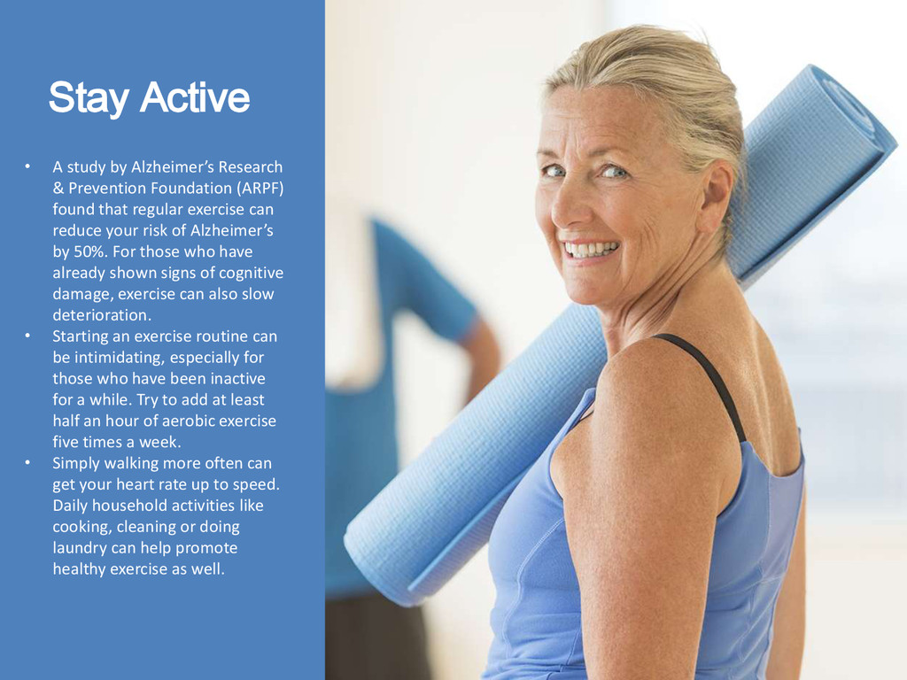Foundation (ARPF) found that regular exercise can reduce your risk of Alzheimer’s by 50%. For those who have already shown signs of cognitive damage, exercise can also slow deterioration. • Starting an exercise routine can be intimidating, especially for those who have been inactive for a while. Try to add at least half an hour of aerobic exercise five times a week. • Simply walking more often can get your heart rate up to speed. Daily household activities like cooking, cleaning or doing laundry can help promote healthy exercise as well.