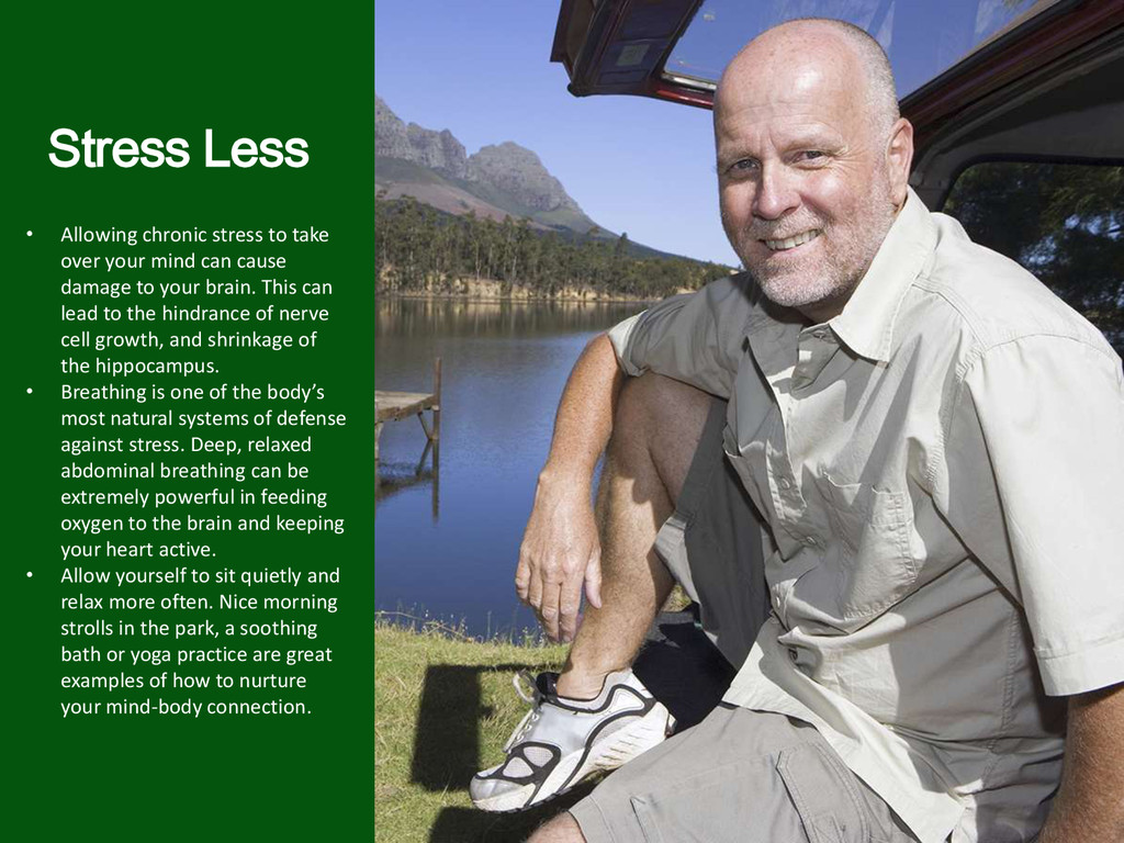 mind can cause damage to your brain. This can lead to the hindrance of nerve cell growth, and shrinkage of the hippocampus. • Breathing is one of the body’s most natural systems of defense against stress. Deep, relaxed abdominal breathing can be extremely powerful in feeding oxygen to the brain and keeping your heart active. • Allow yourself to sit quietly and relax more often. Nice morning strolls in the park, a soothing bath or yoga practice are great examples of how to nurture your mind-body connection.