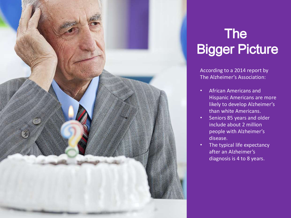 Alzheimer’s Association: • African Americans and Hispanic Americans are more likely to develop Alzheimer’s than white Americans. • Seniors 85 years and older include about 2 million people with Alzheimer’s disease. • The typical life expectancy after an Alzheimer’s diagnosis is 4 to 8 years.