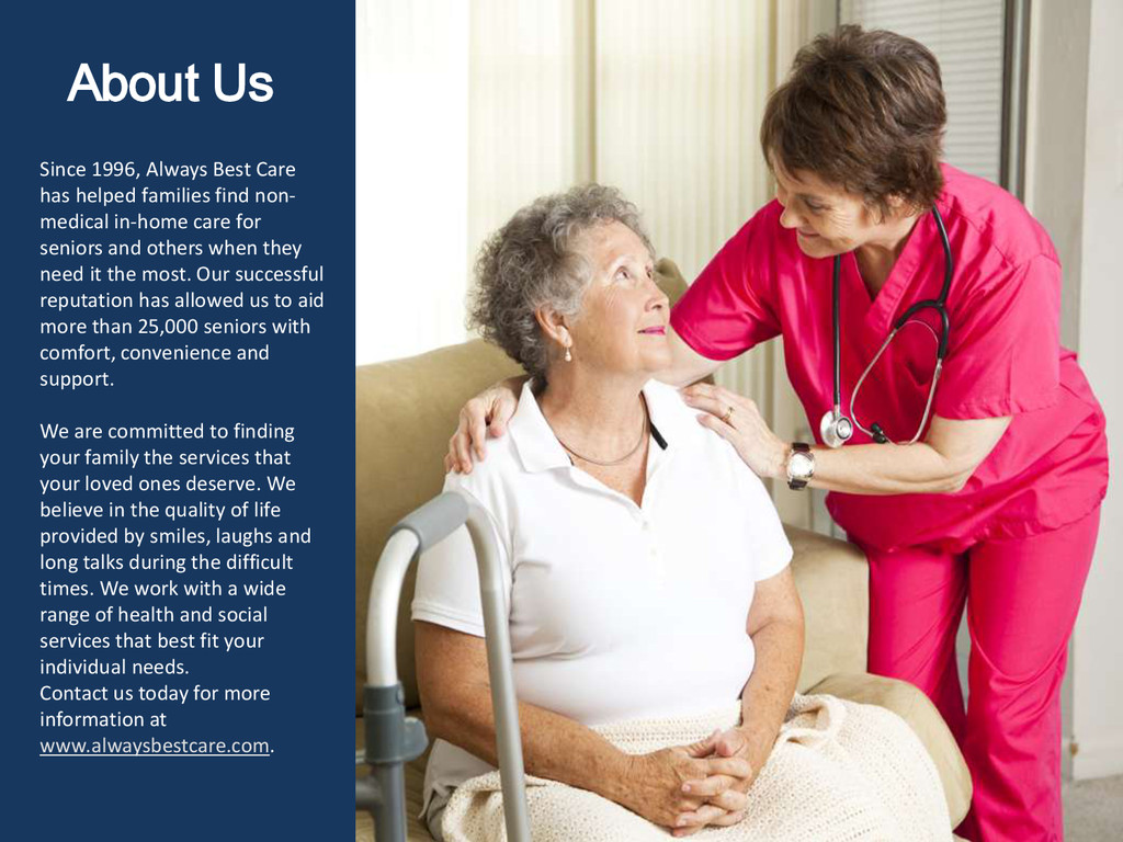 find non- medical in-home care for seniors and others when they need it the most. Our successful reputation has allowed us to aid more than 25,000 seniors with comfort, convenience and support. We are committed to finding your family the services that your loved ones deserve. We believe in the quality of life provided by smiles, laughs and long talks during the difficult times. We work with a wide range of health and social services that best fit your individual needs. Contact us today for more information at www.alwaysbestcare.com.
