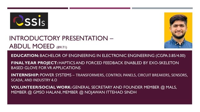 IN ELECTRONIC ENGINEERING (CGPA:3.85/4.00) FINAL YEAR PROJECT: HAPTICS AND FORCED FEEDBACK ENABLED BY EXO-SKELETON BASED GLOVE FOR VR APPLICATIONS INTERNSHIP: POWER SYSTEMS – TRANSFORMERS, CONTROL PANELS, CIRCUIT BREAKERS, SENSORS, SCADA, AND INDUSTRY 4.O VOLUNTEER/SOCIAL WORK: GENERAL SECRETARY AND FOUNDER MEMBER @ MALS, MEMBER @ GMSO HALANI, MEMBER @ NOJAWAN ITTEHAD SINDH