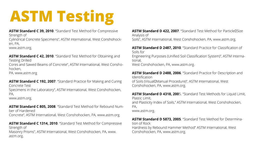 for Compressive Strength of Cylindrical Concrete Specimens”, ASTM International, West Conshohock- en, PA, www.astm.org. ASTM Standard C 42, 2010. “Standard Test Method for Obtaining and Testing Drilled Cores and Sawed Beams of Concrete”, ASTM International, West Consho- hocken, PA, www.astm.org ASTM Standard C 192, 2007. “Standard Practice for Making and Curing Concrete Test Specimens in the Laboratory”, ASTM International, West Conshohocken, PA, www.astm.org. ASTM Standard C 805, 2008. “Standard Test Method for Rebound Num- ber of Hardened Concrete”, ASTM International, West Conshohocken, PA, www.astm.org. ASTM Standard C 1314, 2010. “Standard Test Method for Compressive Strength of Masonry Prisms”, ASTM International, West Conshohocken, PA, www. astm.org. ASTM Standard D 422, 2007. “Standard Test Method for Particle‐Size Analysis of Soils”, ASTM International, West Conshohocken, PA, www.astm.org. ASTM Standard D 2487, 2010. “Standard Practice for Classification of Soils for Engineering Purposes (Unified Soil Classification System)”, ASTM Interna- tional, West Conshohocken, PA, www.astm.org. ASTM Standard D 2488, 2006. “Standard Practice for Description and Identification of Soils (Visual‐Manual Procedure)”, ASTM International, West Conshohocken, PA, www.astm.org. ASTM Standard D 4318, 2005. “Standard Test Methods for Liquid Limit, Plastic Limit, and Plasticity Index of Soils,” ASTM International, West Conshohocken, PA, www.astm.org. ASTM Standard D 5873, 2005. “Standard Test Method for Determina- tion of Rock Hardness by Rebound Hammer Method” ASTM International, West Conshohocken, PA, www.astm.org.