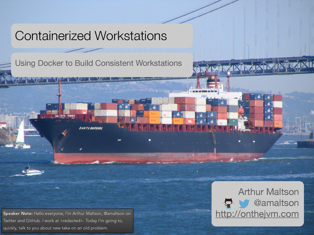 bay area, https://flic.kr/p/pnSzL • Slide 1, 20 - Twitter, Twitter logo blue, https://about.twitter.com/press/brand-assets • Slide 1, 20 - GitHub, Octocat, https://github.com/logos • Slide 2 - Steven and Sarah, Garage Workbench, https://flic.kr/p/f4oak • Slide 3 - Cuny Academic Commons, Motivate Yak Shaving, http://pmip.googlecode.com/svn/trunk/talk/PMIP/img/motivate_yak_shaving.jpg • Slide 4 - mob mob, Finished Workbench - front, https://flic.kr/p/57Kmmq • Slide 5 - Paul Englefield, Workbench, https://flic.kr/p/3aLRao • Slide 6, 18 - Mike Fischer, Workbench, https://flic.kr/p/c83Zy9 • Slide 7, 8 - Sue, Blue Tool Box, https://flic.kr/p/cHgsCQ • Slide 8, 15, 19 - Docker Inc, Docker Logo, https://www.docker.com/legal/marks_and_logos/ • Slide 9, 10, 19 - Morten Nisker Toppenberg, Mobile electronics workbench open, https://flic.kr/p/8yWpiA • Slide 10, 19 - Docker Inc, Fig Logo, http://www.fig.sh/index.html • Slide 15 - Wikimedia, Sublime Text Logo, http://upload.wikimedia.org/wikipedia/en/4/4c/Sublime_Text_Logo.png • Slide 15 - vim.org, Vim: the Editor, http://www.vim.org/logos.php • Slide 15 - GitHub, Atom logo, https://raw.githubusercontent.com/atom/settings-view/master/images/atom.png • Slide 15 - Pivotal, Jasmine logo, https://github.com/pivotal/jasmine/wiki • Slide 15 - Grunt, Grunt logo, https://raw.githubusercontent.com/gruntjs/gruntjs.com/master/src/img/grunt-logo.png • Slide 15 - Apache Foundation, Maven logo, http://maven.apache.org/images/maventxt_logo_200.gif • Slide 15 - David Heinemeier Hansson, Rails Logo remix, https://github.com/rails/rails/blob/master/guides/assets/images/rails_logo_remix.gif • Slide 16, 17 - Wikimedia, Chef Software Inc. company logo, http://en.wikipedia.org/wiki/Chef_(company) • Slide 20 - imgflip, All The Things, https://imgflip.com/i/c03xj Arthur Maltson @amaltson http://onthejvm.com