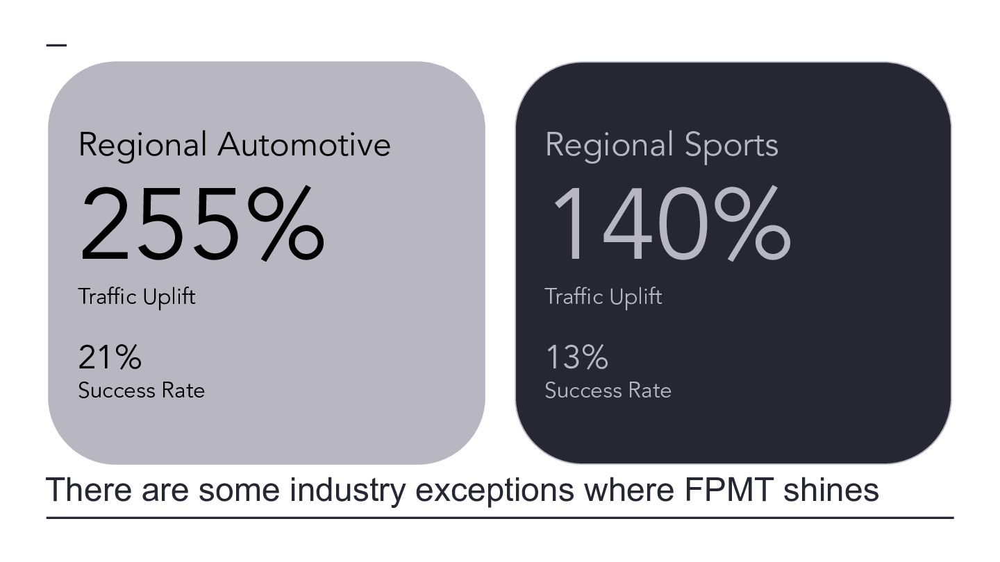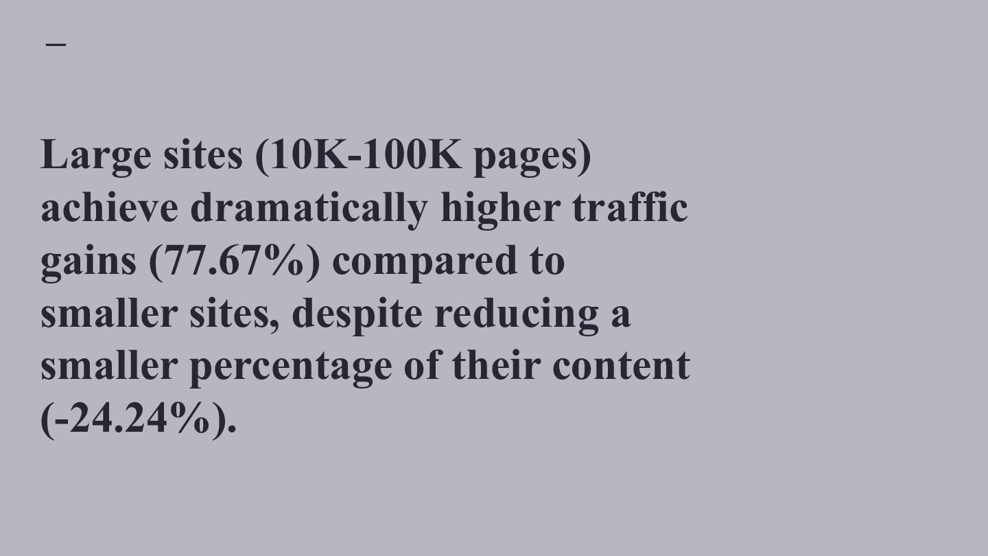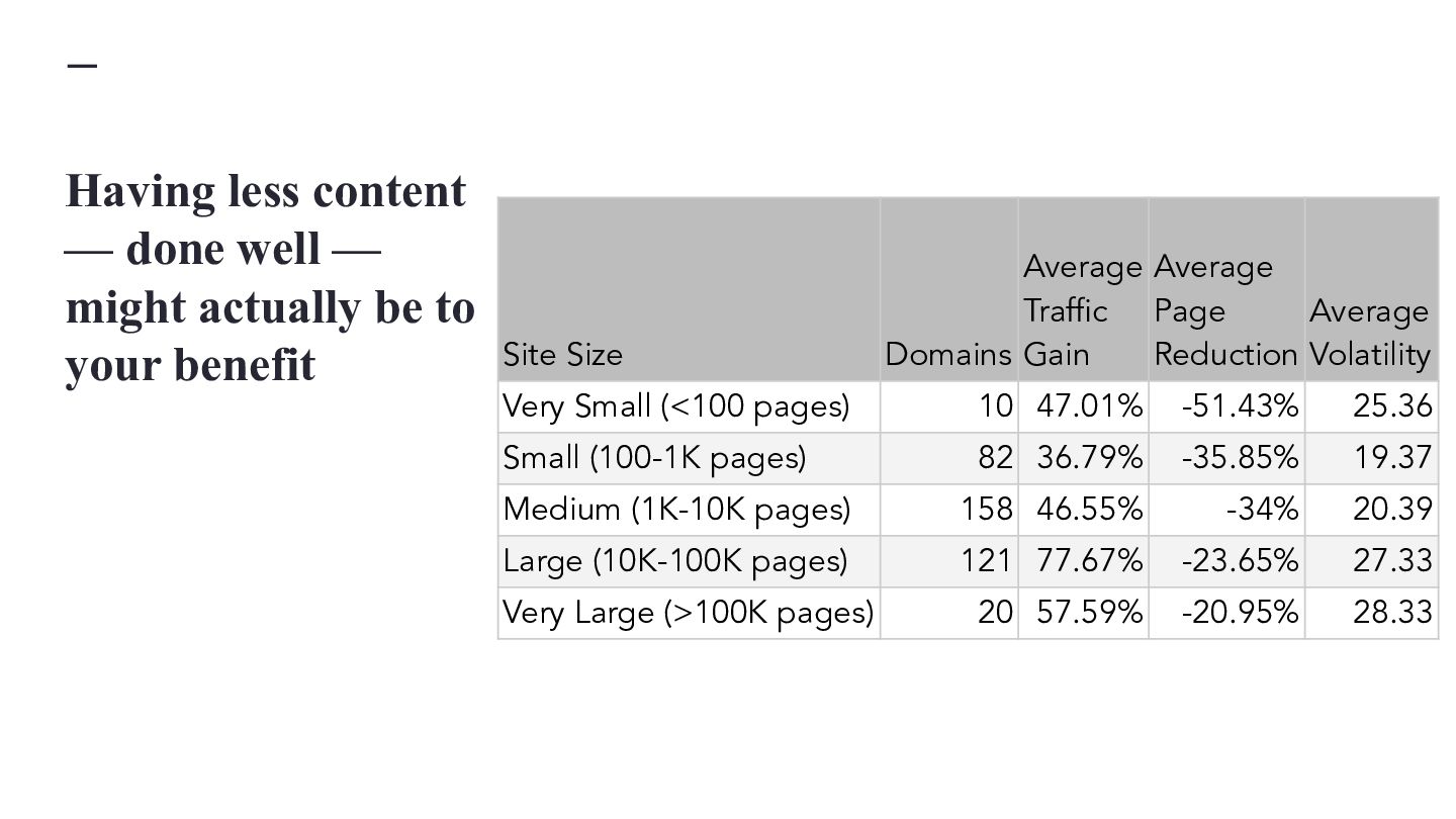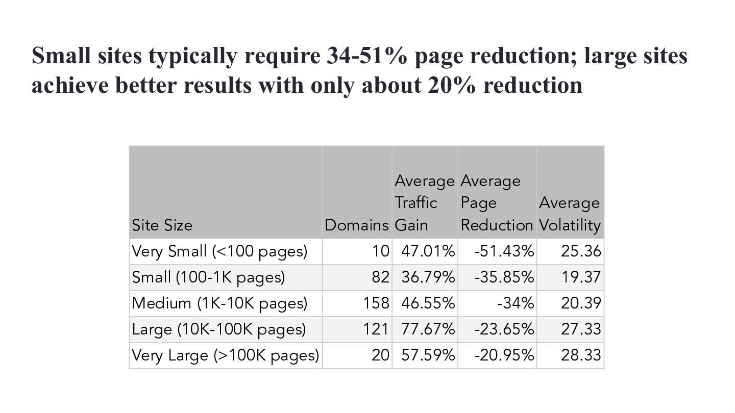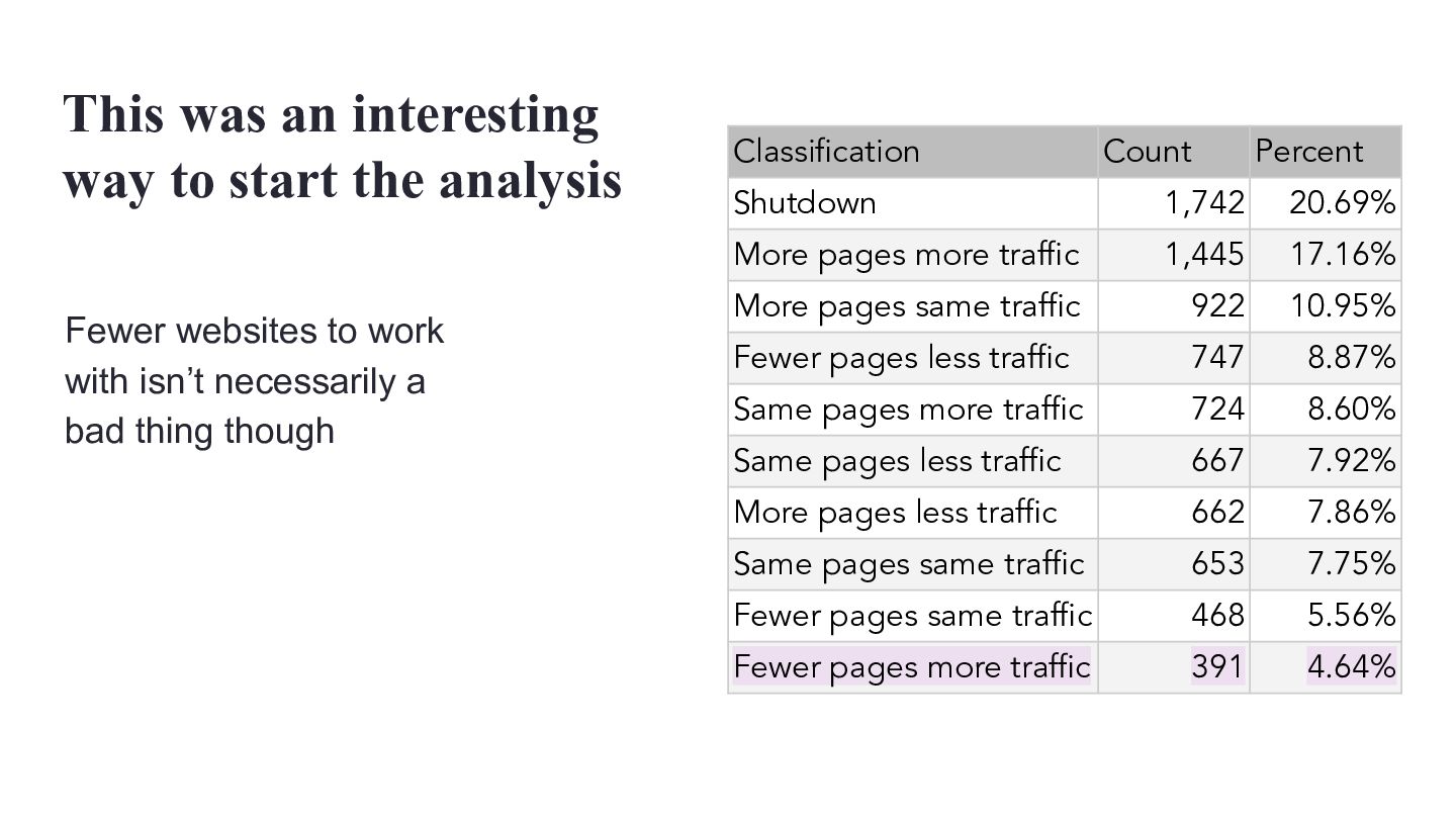 websites, not super massive ones Classification Average Start Pages Average End Pages Average Absolute Page Change Average Relative Page Change Average Traffic Change MPMT 16,130 26,910 10,780 81.40% 74.11% MPST 11,690 16,504 4,814 67.65% -6.15% FPLT 29,487 19,659 -9,828 -34.16% -55.92% SPMT 18,860 20,215 1,355 12.26% 50.78% SPLT 10,799 10,902 103 11.11% -51.01% MPLT 10,090 14,397 4,307 76.80% -46.09% SPST 15,222 15,532 310 10.45% -8.91% FPST 32,028 20,756 -11,272 -30.72% -10.85% FPMT 30,353 22,168 -8,185 -30.96% 54.71%