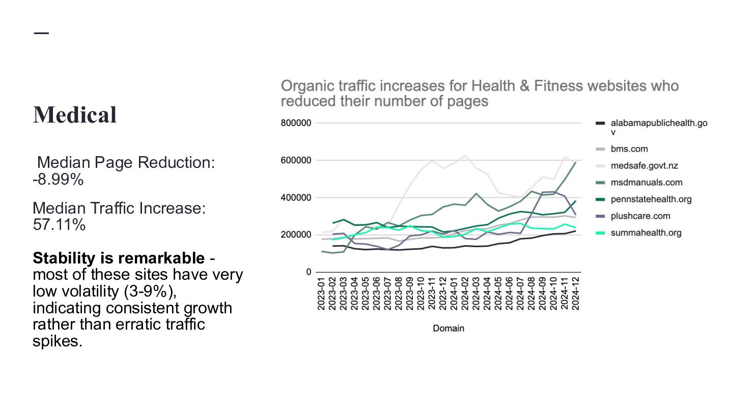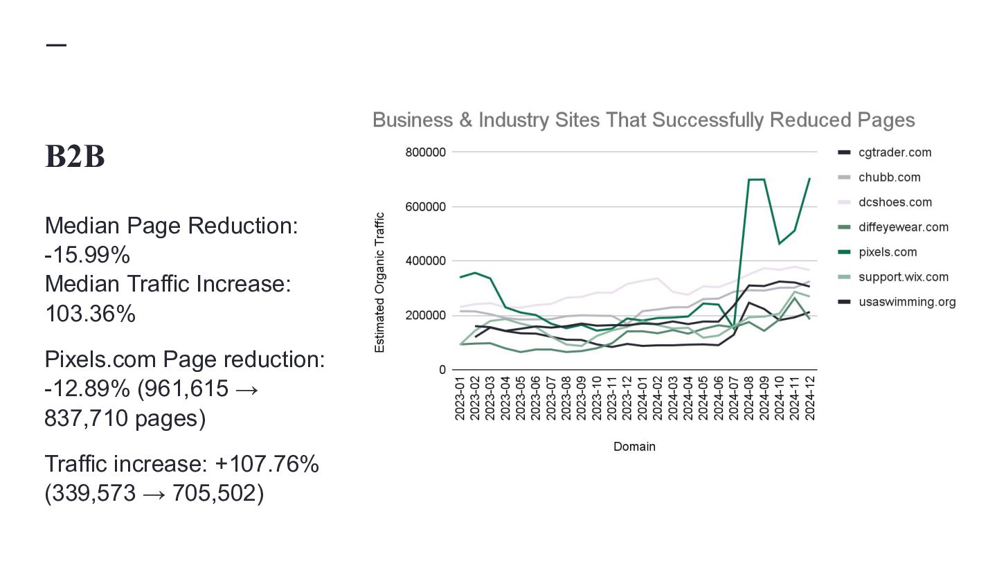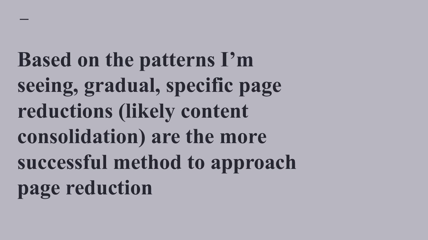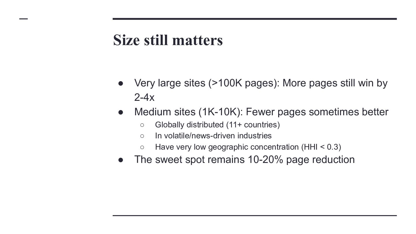 websites, not super massive ones Classification Average Start Pages Average End Pages Average Absolute Page Change Average Relative Page Change Average Traffic Change MPMT 16,130 26,910 10,780 81.40% 74.11% MPST 11,690 16,504 4,814 67.65% -6.15% FPLT 29,487 19,659 -9,828 -34.16% -55.92% SPMT 18,860 20,215 1,355 12.26% 50.78% SPLT 10,799 10,902 103 11.11% -51.01% MPLT 10,090 14,397 4,307 76.80% -46.09% SPST 15,222 15,532 310 10.45% -8.91% FPST 32,028 20,756 -11,272 -30.72% -10.85% FPMT 30,353 22,168 -8,185 -30.96% 54.71%