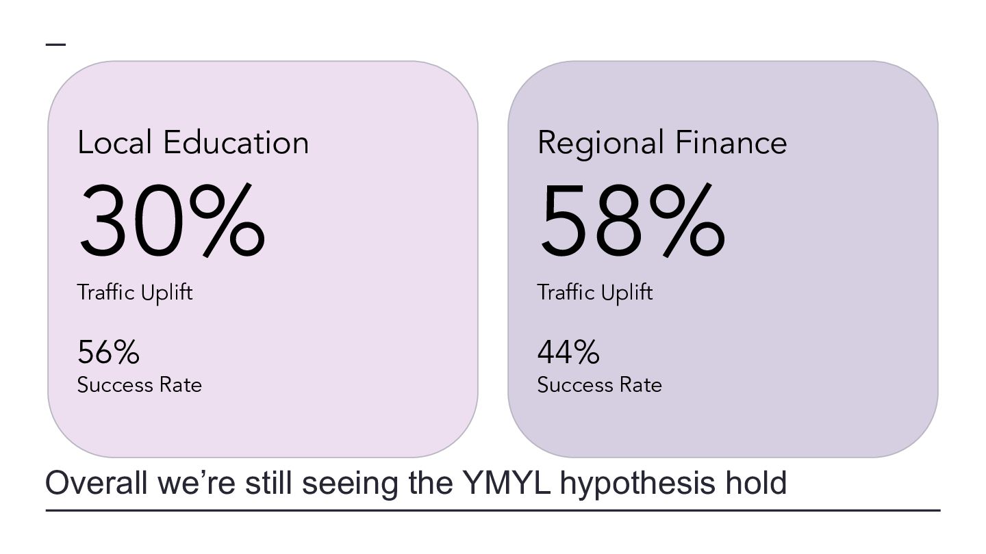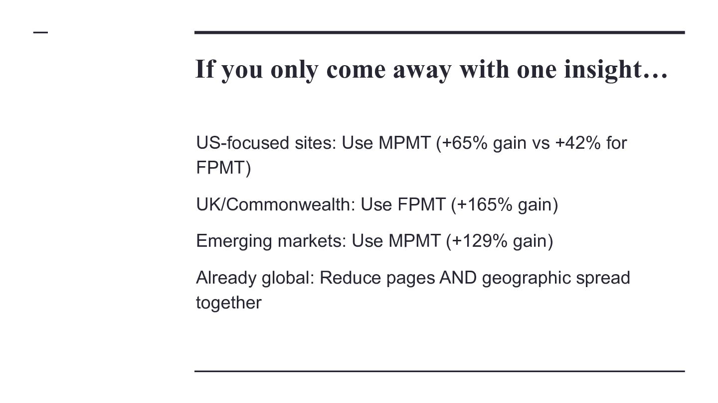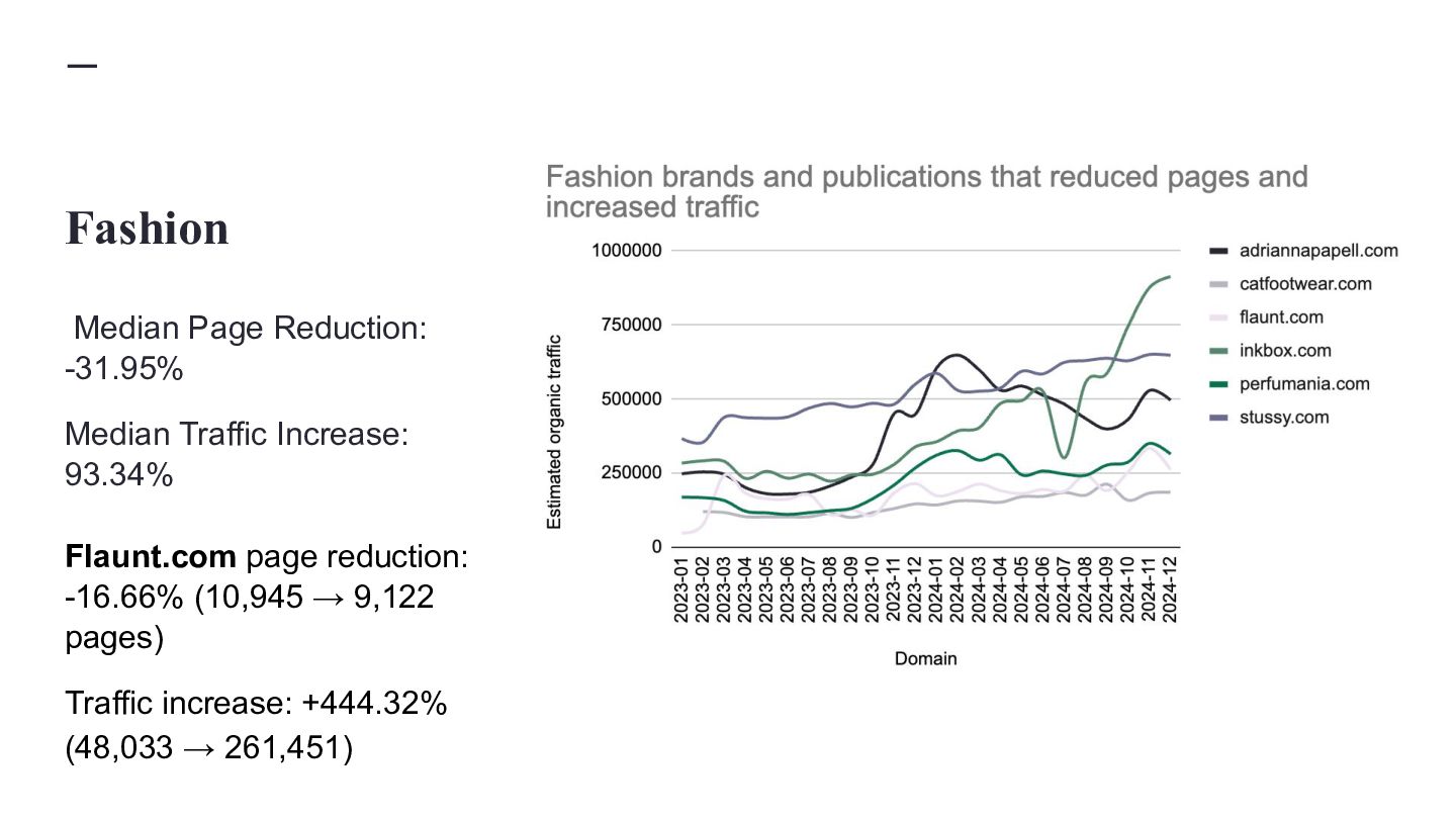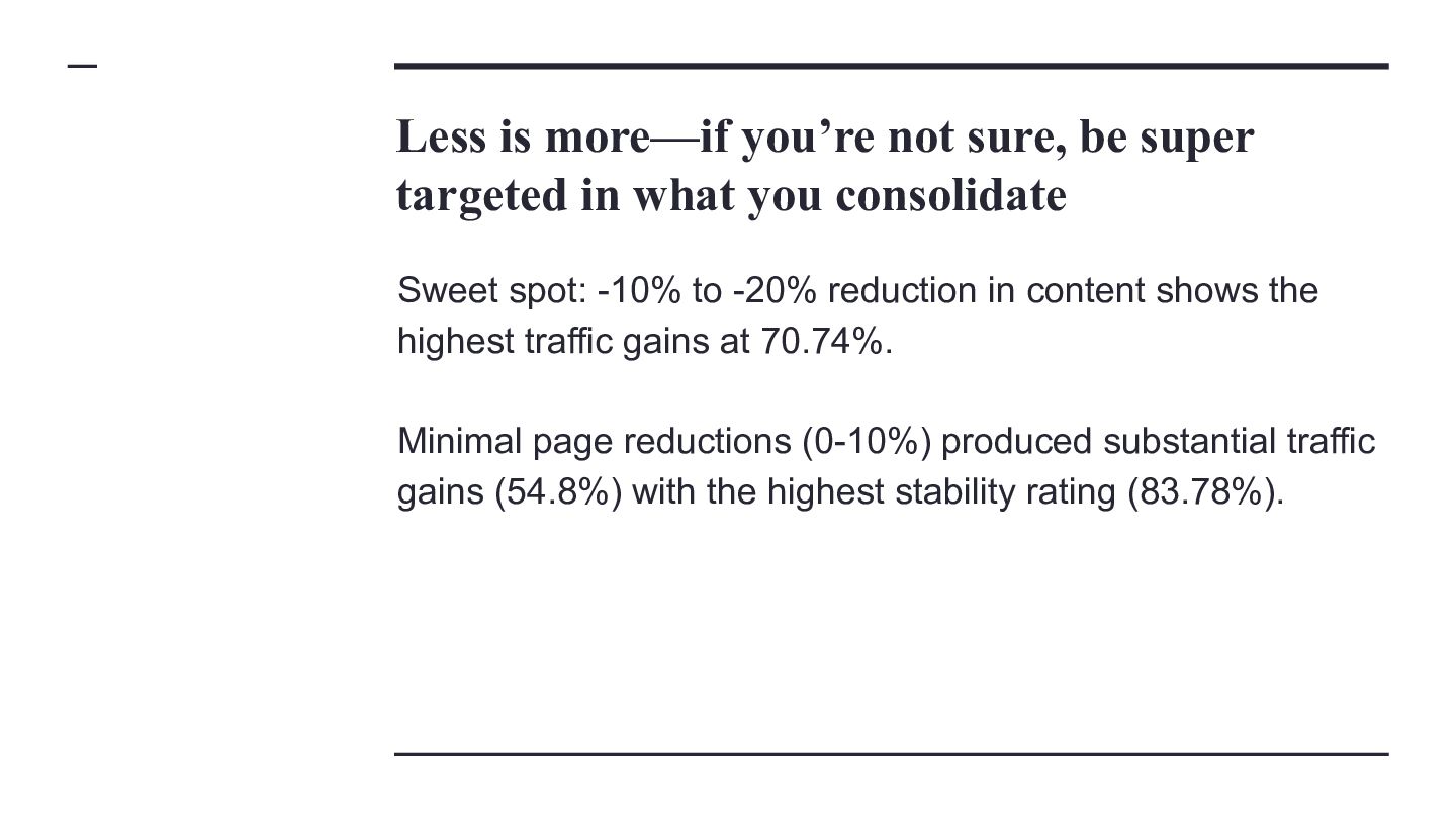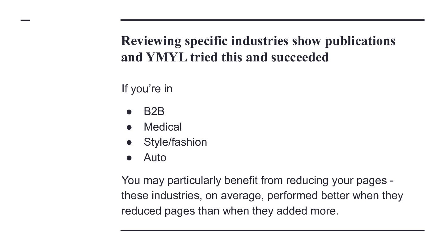 websites, not super massive ones Classification Average Start Pages Average End Pages Average Absolute Page Change Average Relative Page Change Average Traffic Change MPMT 16,130 26,910 10,780 81.40% 74.11% MPST 11,690 16,504 4,814 67.65% -6.15% FPLT 29,487 19,659 -9,828 -34.16% -55.92% SPMT 18,860 20,215 1,355 12.26% 50.78% SPLT 10,799 10,902 103 11.11% -51.01% MPLT 10,090 14,397 4,307 76.80% -46.09% SPST 15,222 15,532 310 10.45% -8.91% FPST 32,028 20,756 -11,272 -30.72% -10.85% FPMT 30,353 22,168 -8,185 -30.96% 54.71%
