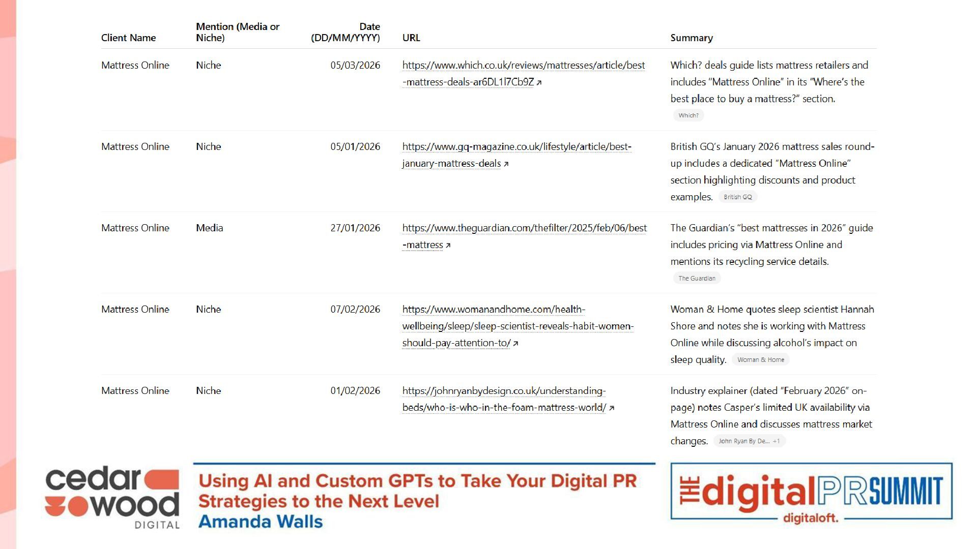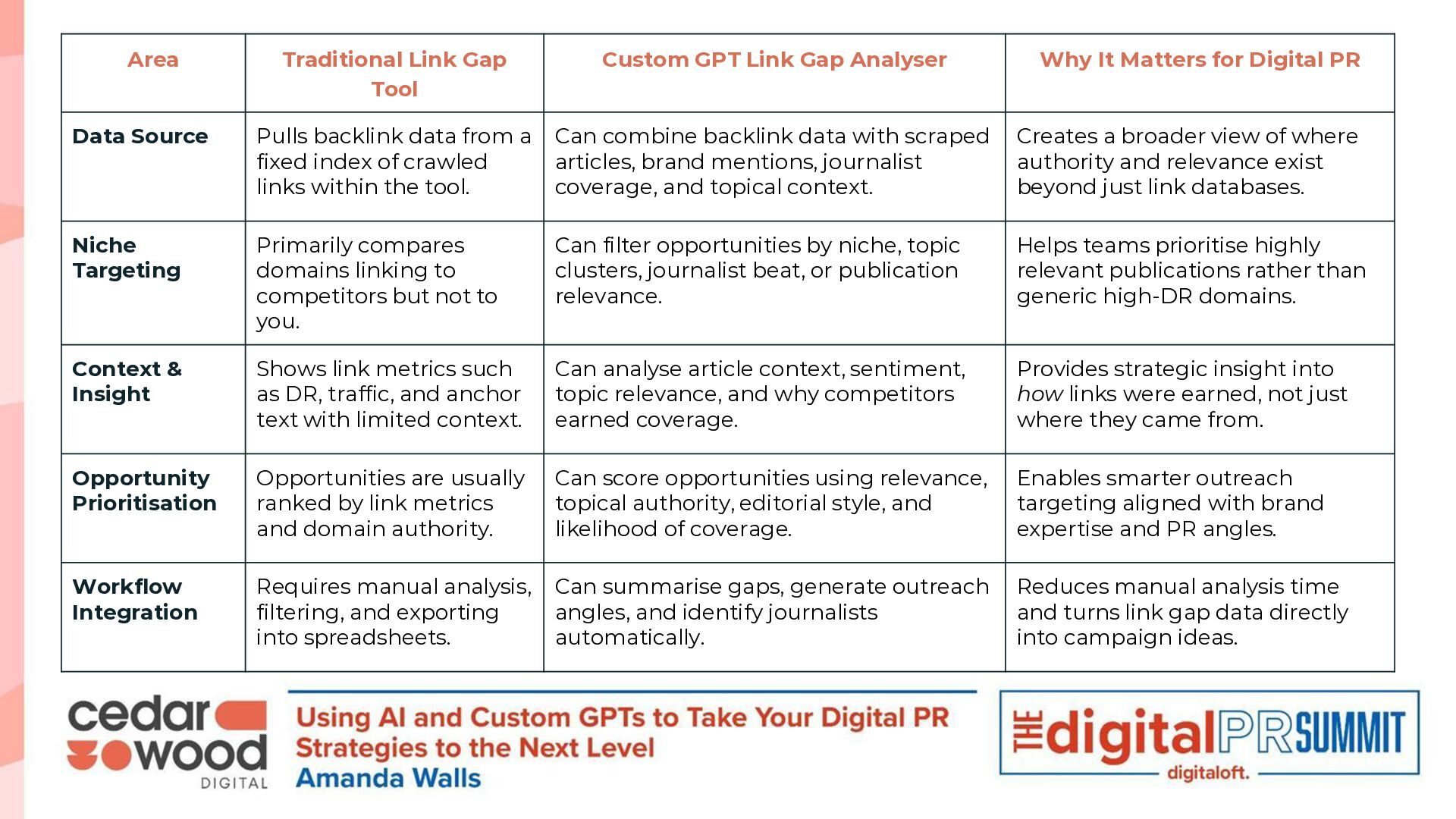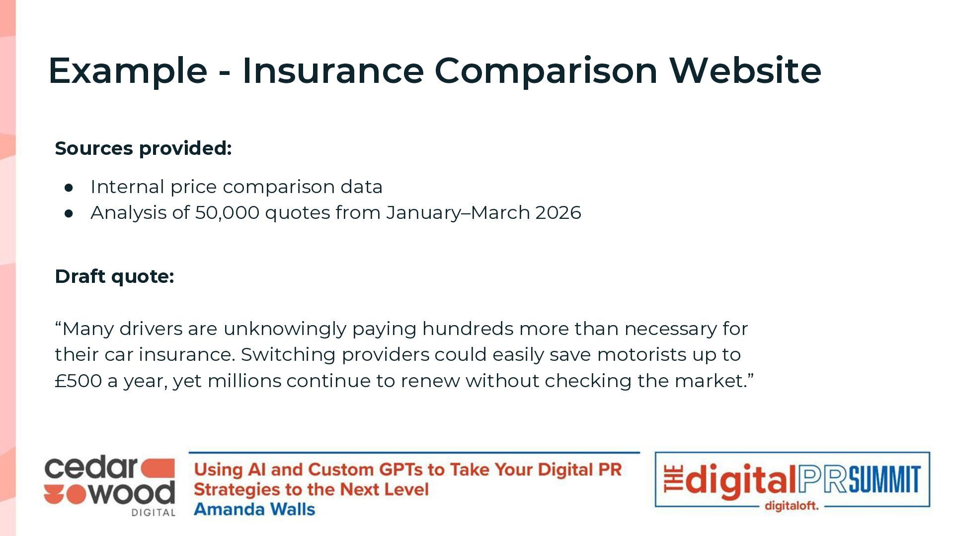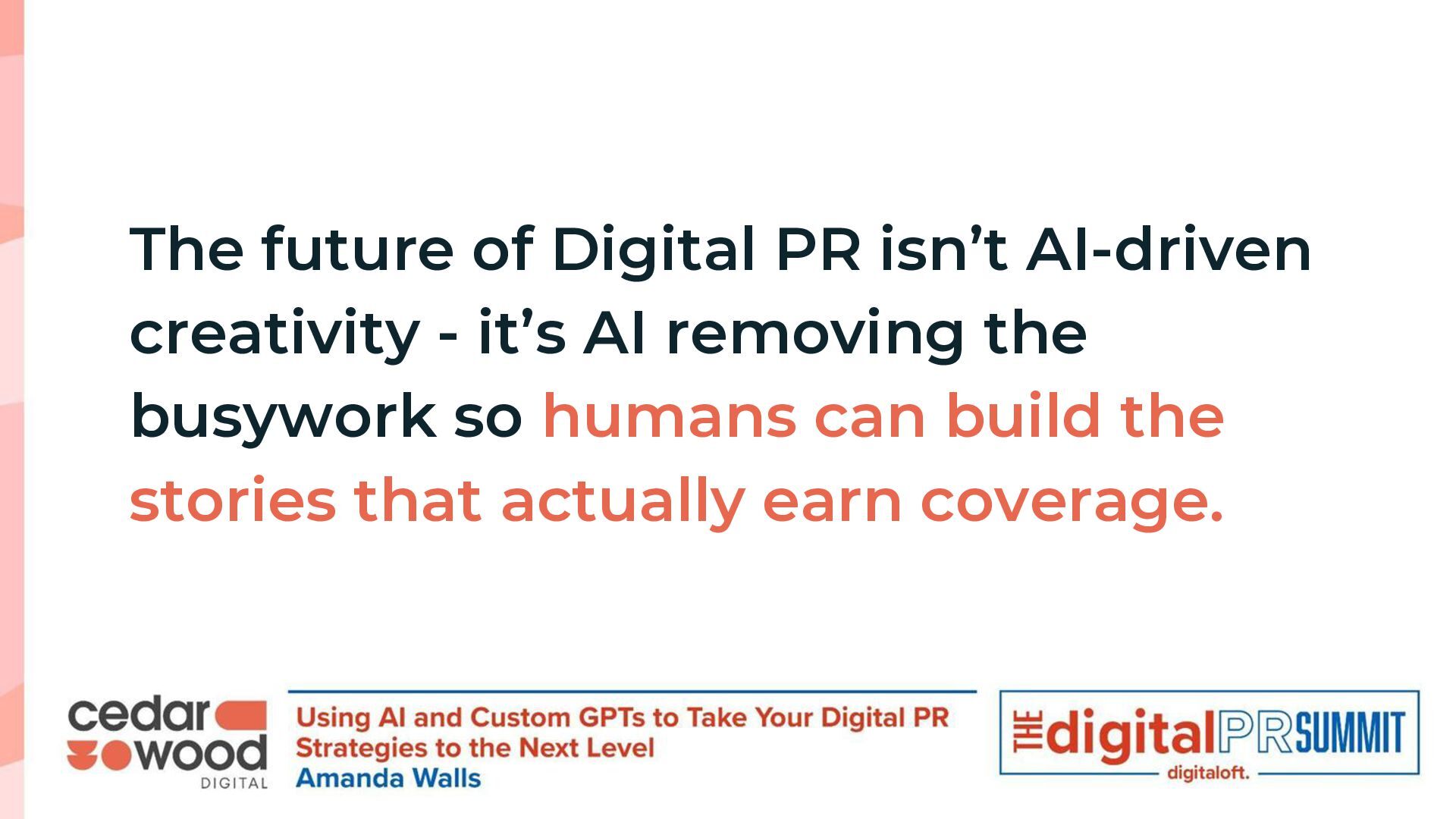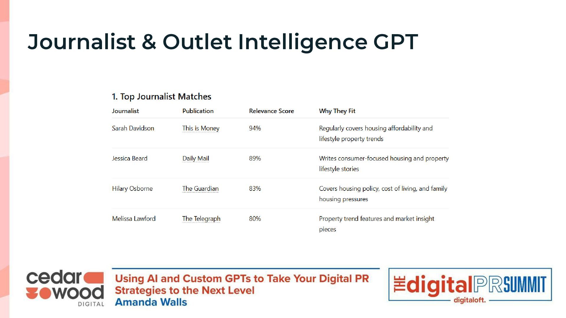 Amanda then introduces a framework of five custom GPTs designed to streamline digital PR workflows, including tools for compliance and risk assessment, newsjacking, coverage tracking, link gap analysis, and journalist intelligence. Through practical examples, such as validating financial claims in PR campaigns, she demonstrates how these tools can reduce risk, improve relevance, and uncover more targeted opportunities. The overarching message is that the future of digital PR lies not in AI driven creativity, but in using AI to remove manual workload, enabling PR professionals to focus on building stronger stories, relationships, and authority signals that drive meaningful coverage.