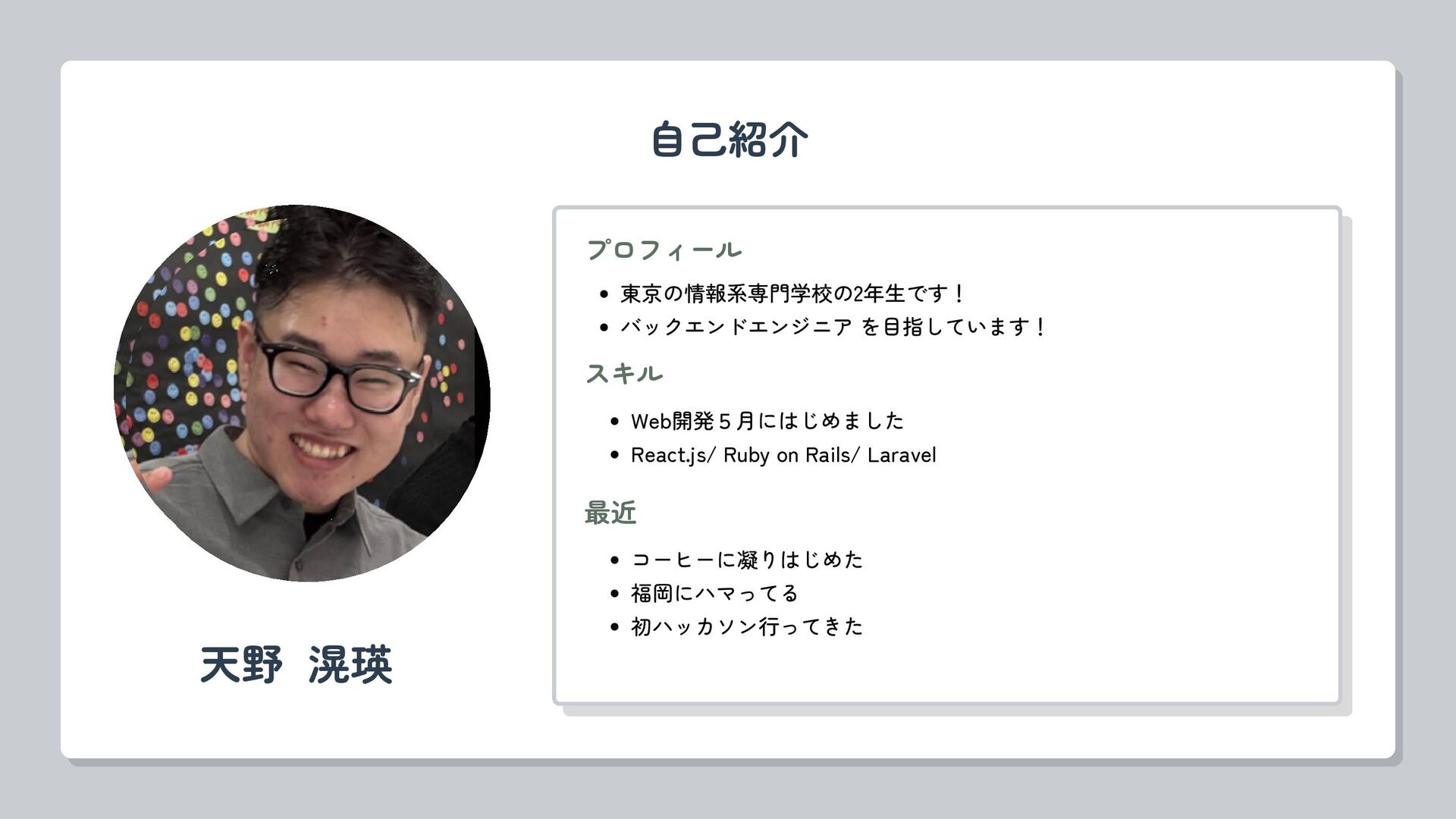 自己紹介 天野 滉瑛 プロフィール 東京の情報系専門学校の2年生です! バックエンドエンジニア を目指しています! スキル Web開発5月にはじめました React.js/