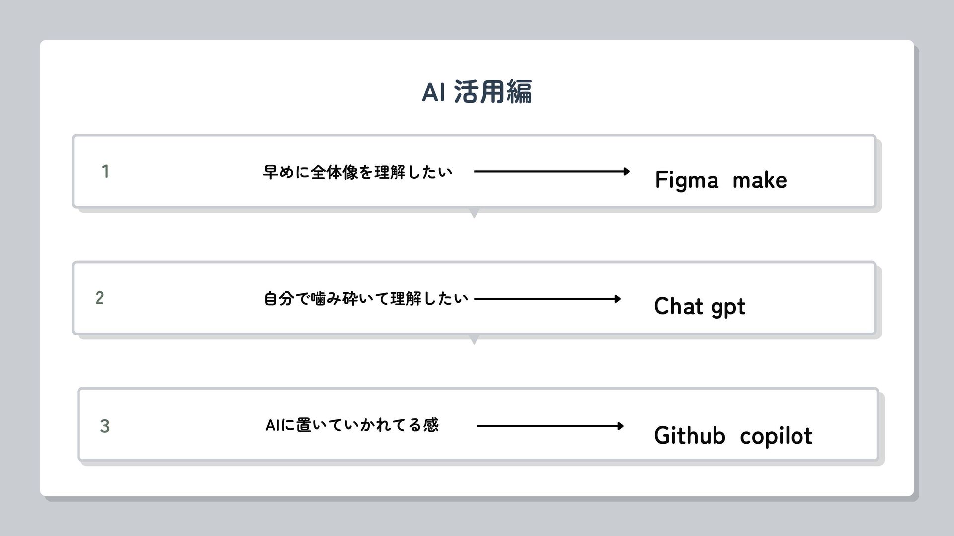 AI 活用編 1 早めに全体像を理解したい Figma make 3 AIに置いていかれてる感 Github copilot