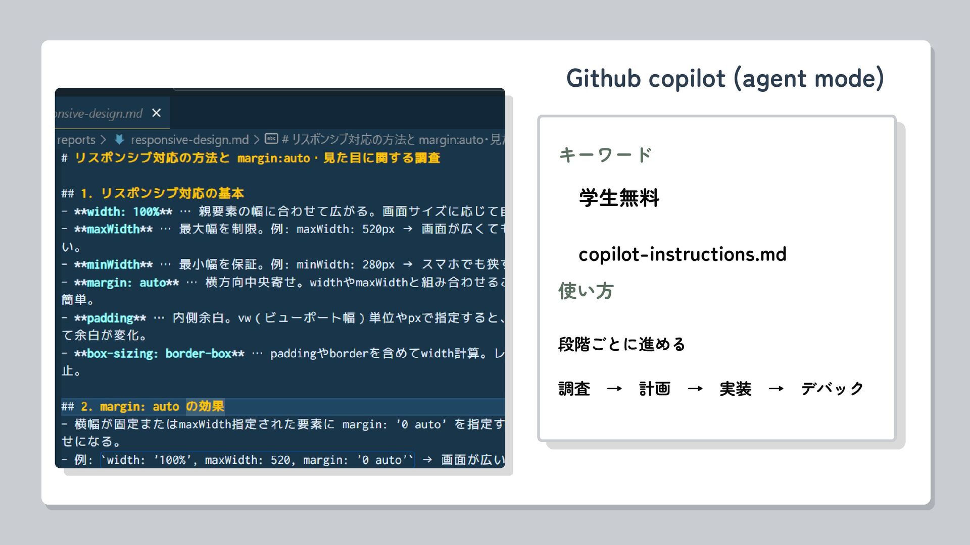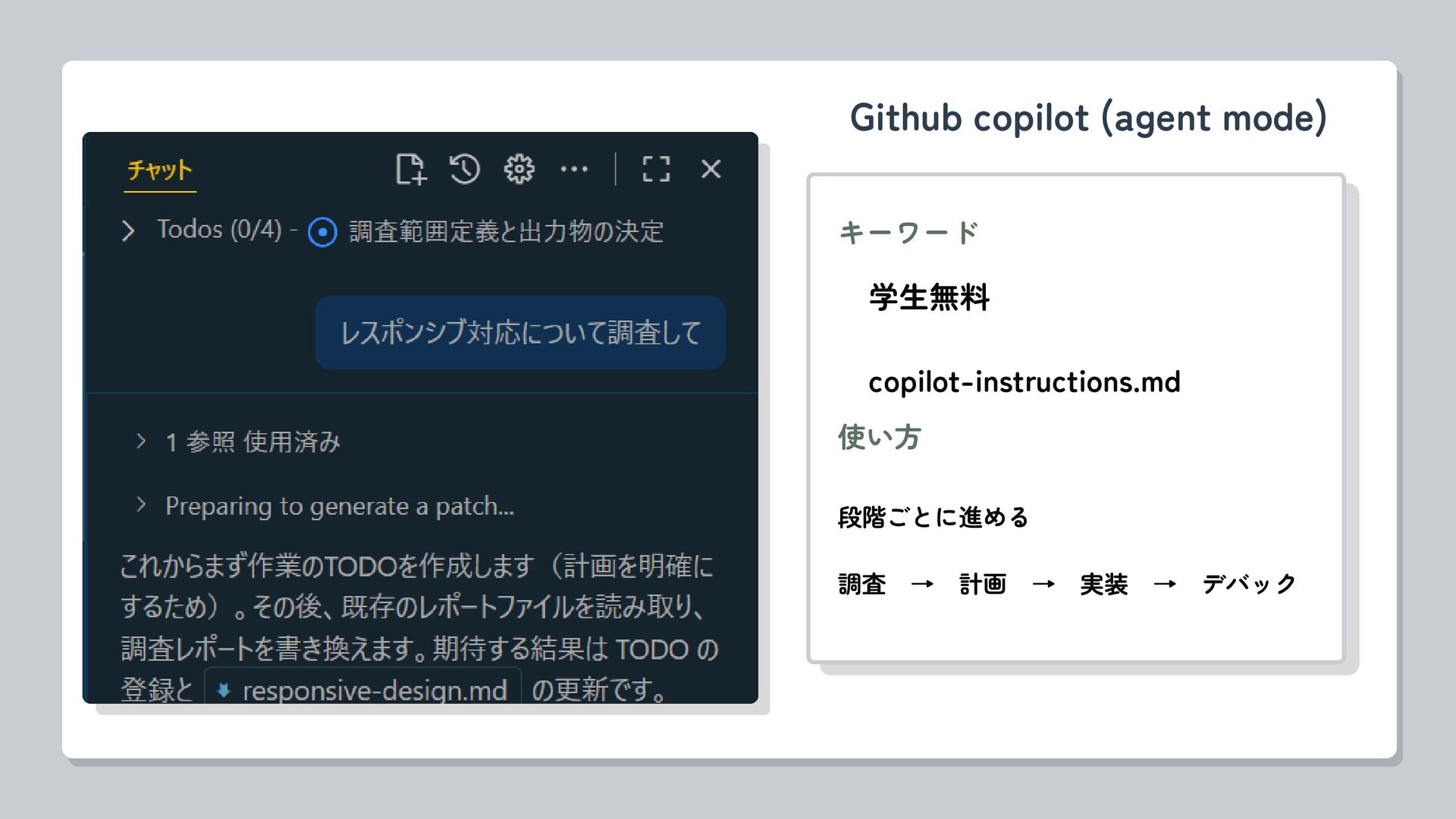 Github copilot (agent mode) キーワード 学生無料 copilot-instructions.md 段階ごとに進める 調査 → 計画 → 実装 → デバック 使い方