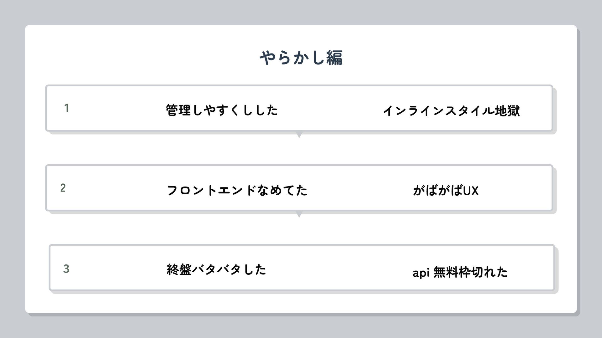 やらかし編 1 管理しやすくしした インラインスタイル地獄 3 終盤バタバタした api 無料枠切れた 2 フロントエンドなめてた