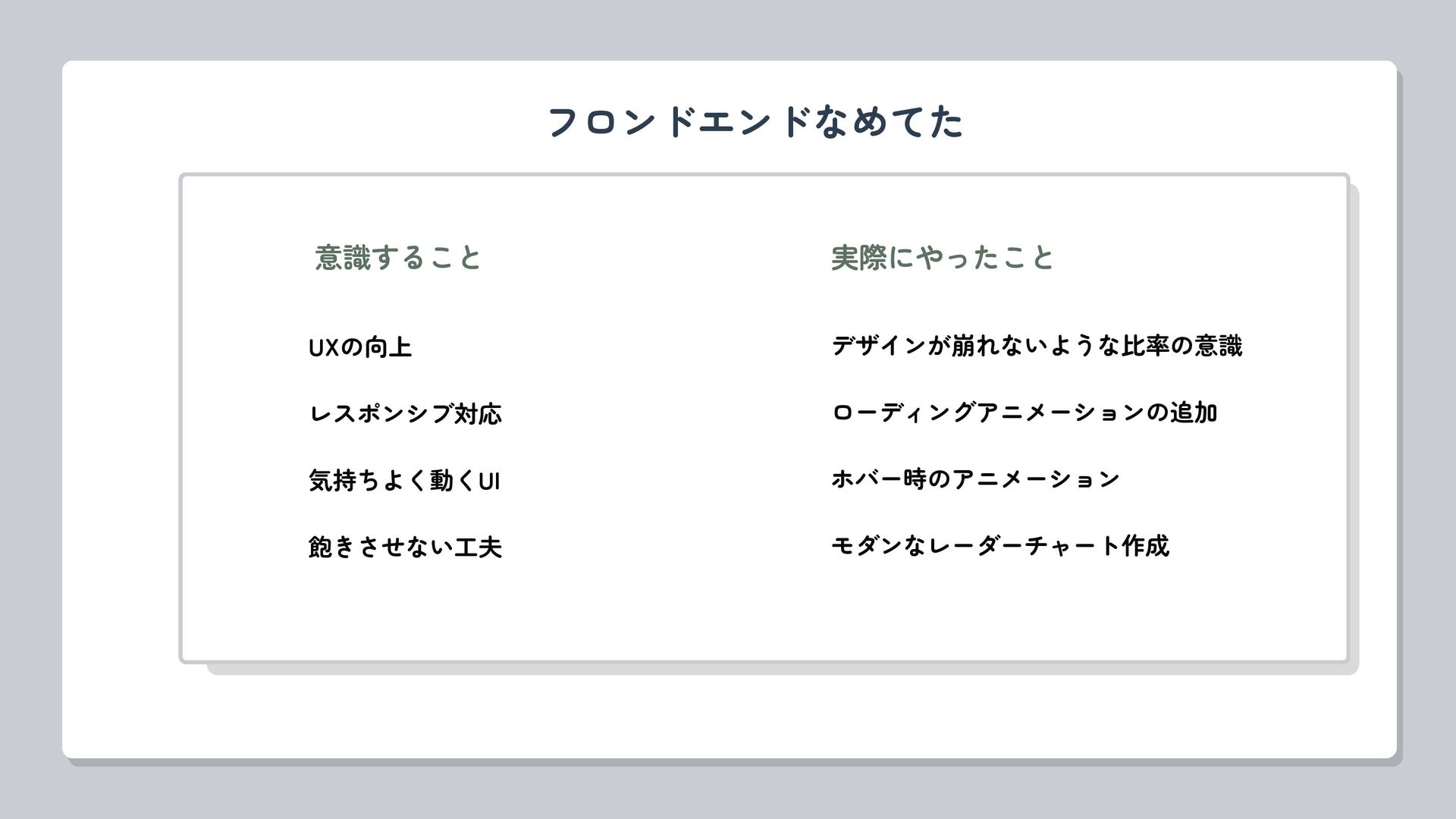 意識すること UXの向上 レスポンシブ対応 気持ちよく動くUI 飽きさせない工夫 フロンドエンドなめてた デザインが崩れないような比率の意識 ローディングアニメーションの追加 ホバー時のアニメーション モダンなレーダーチャート作成