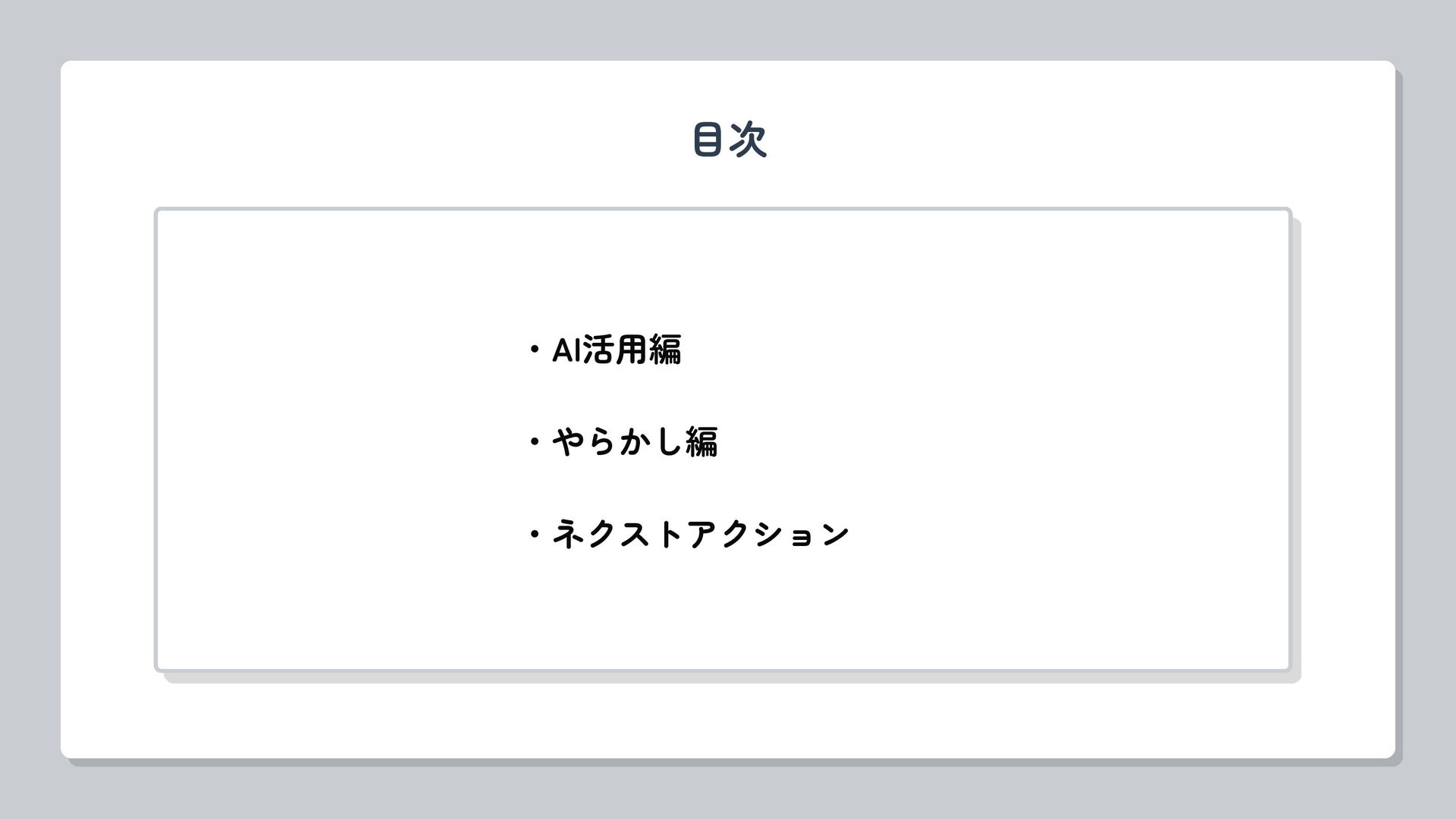 ・AI活用編 ・やらかし編 ・ネクストアクション 目次