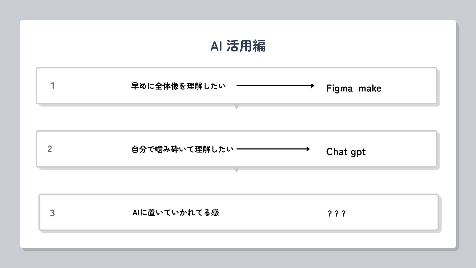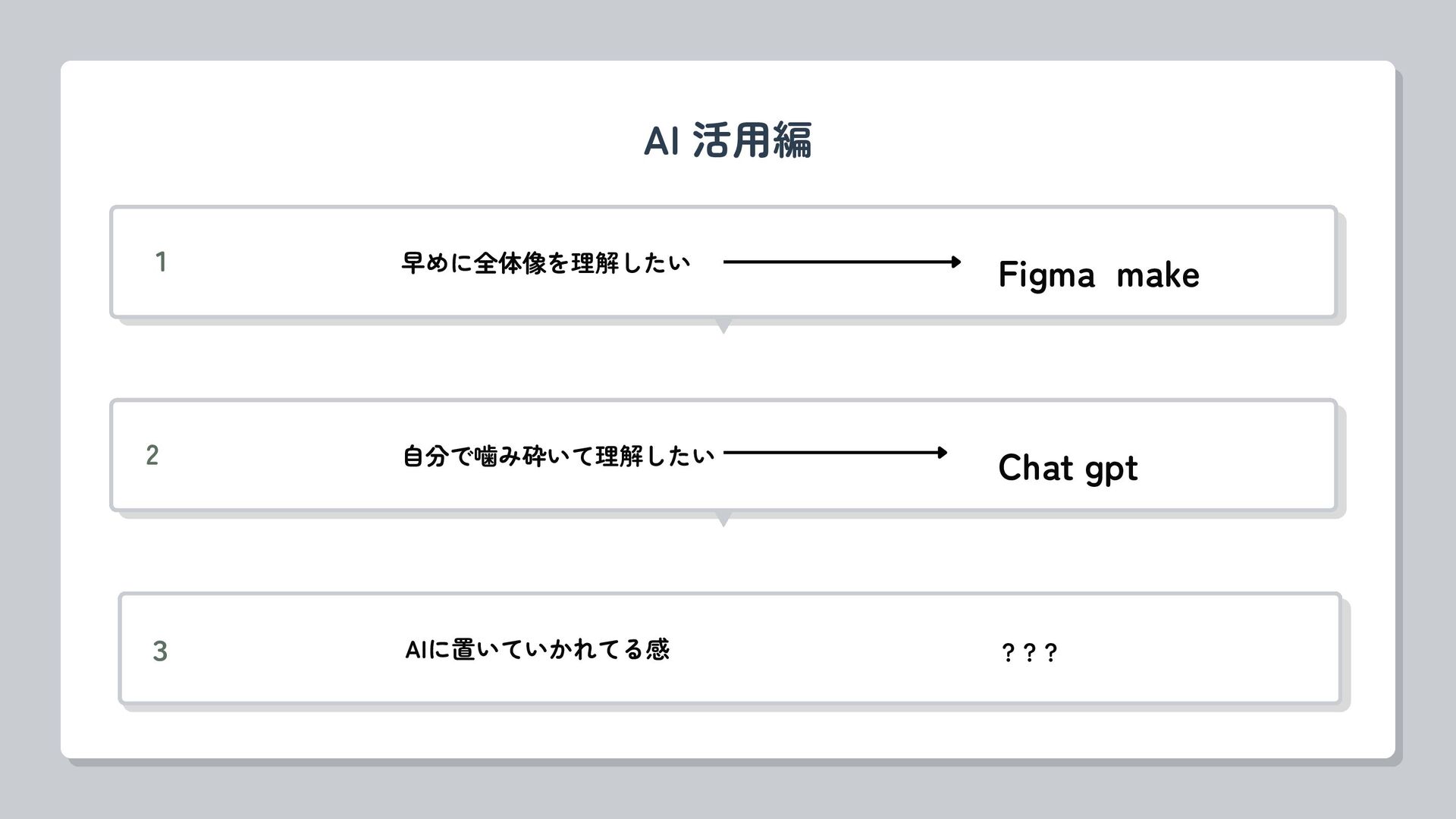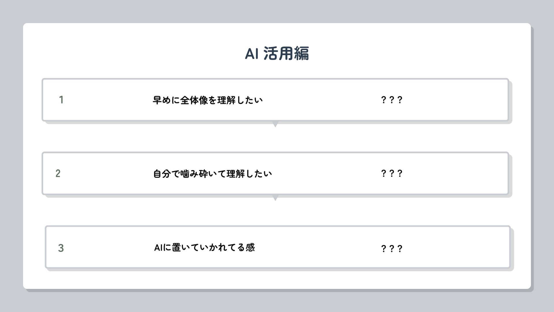 AI 活用編 1 早めに全体像を理解したい ??? 3 AIに置いていかれてる感 ??? 2 自分で噛み砕いて理解したい