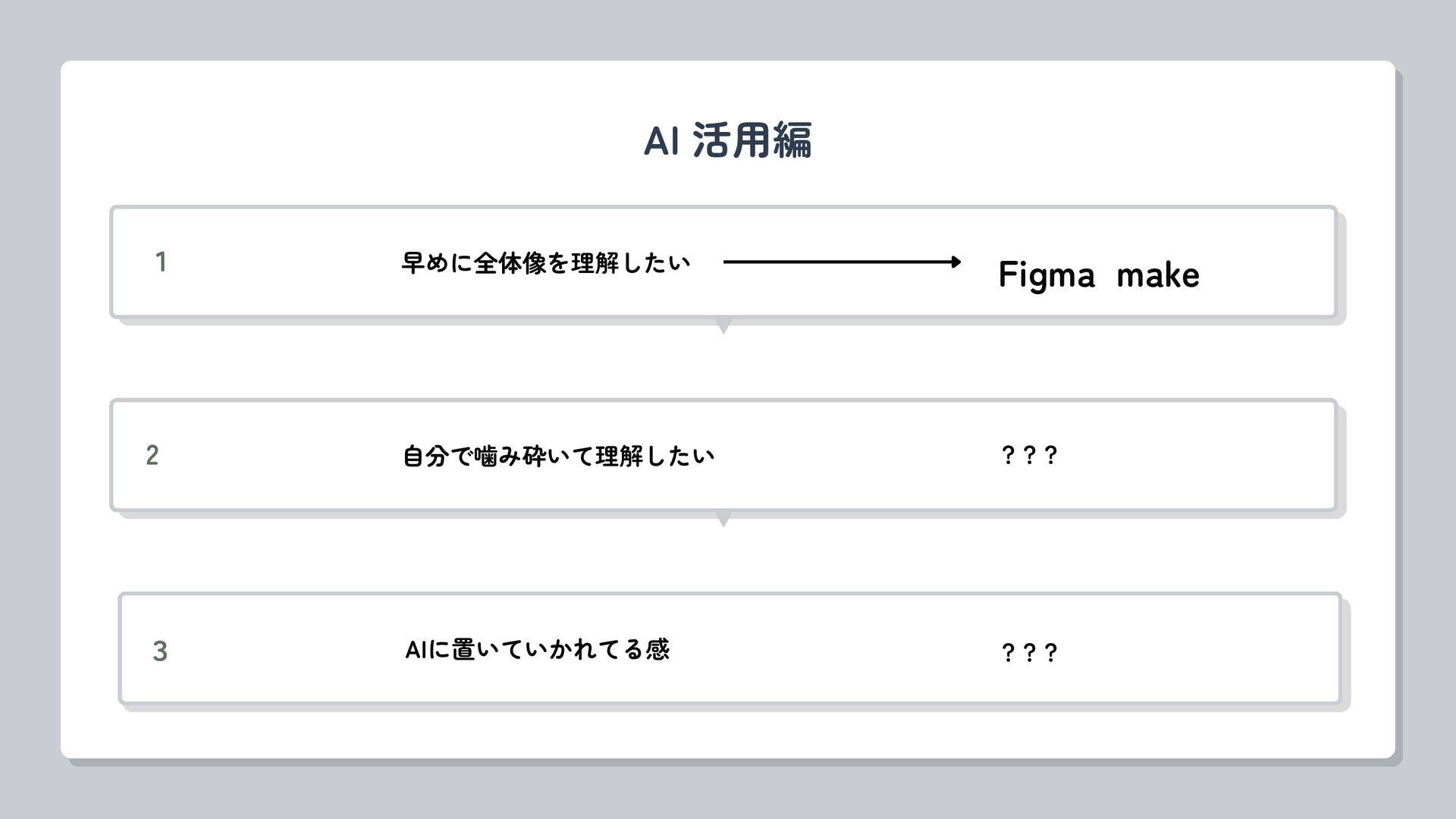 AI 活用編 1 早めに全体像を理解したい Figma make 3 AIに置いていかれてる感 ??? 2