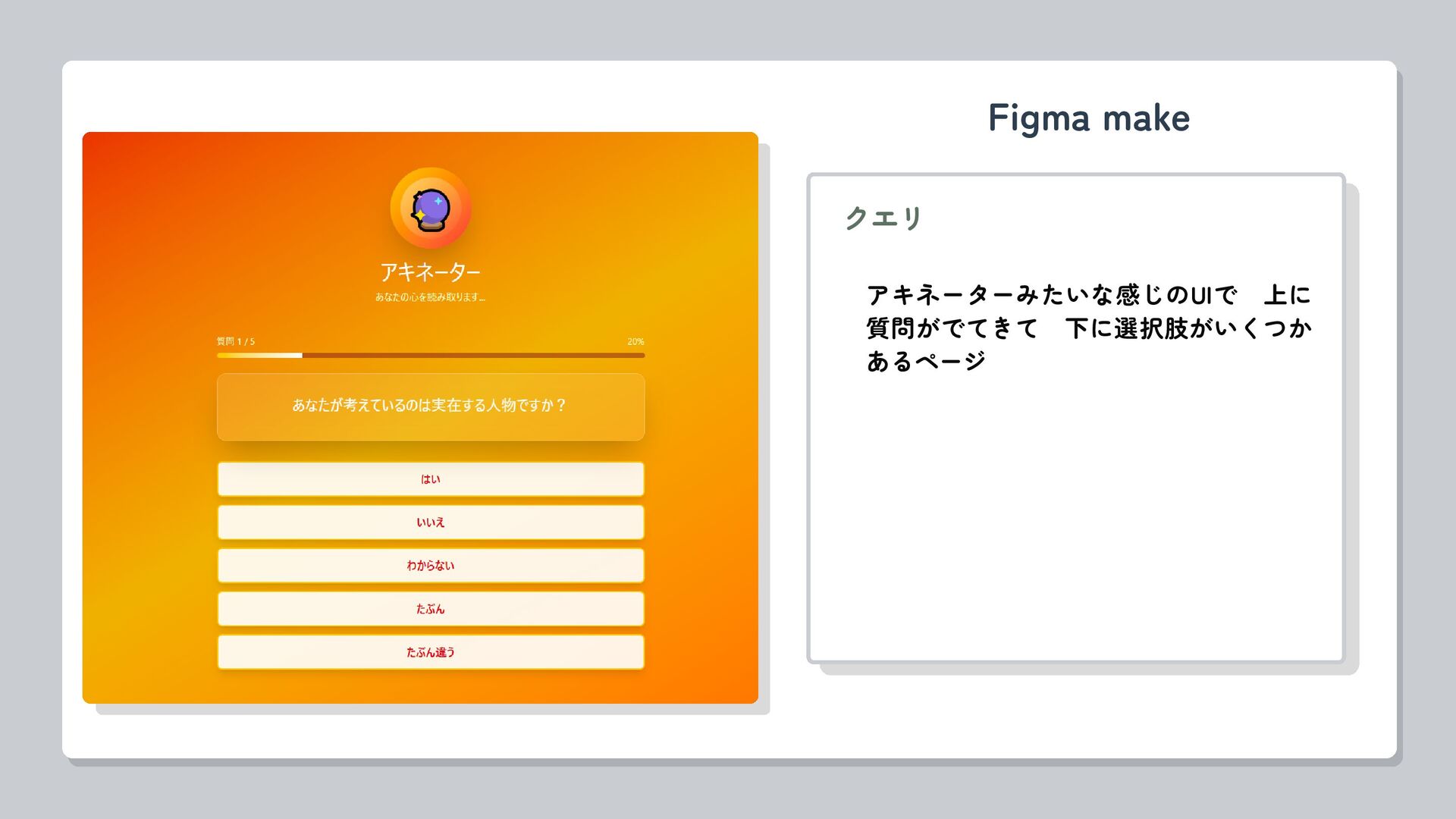 クエリ アキネーターみたいな感じのUIで 上に 質問がでてきて 下に選択肢がいくつか あるページ Figma make