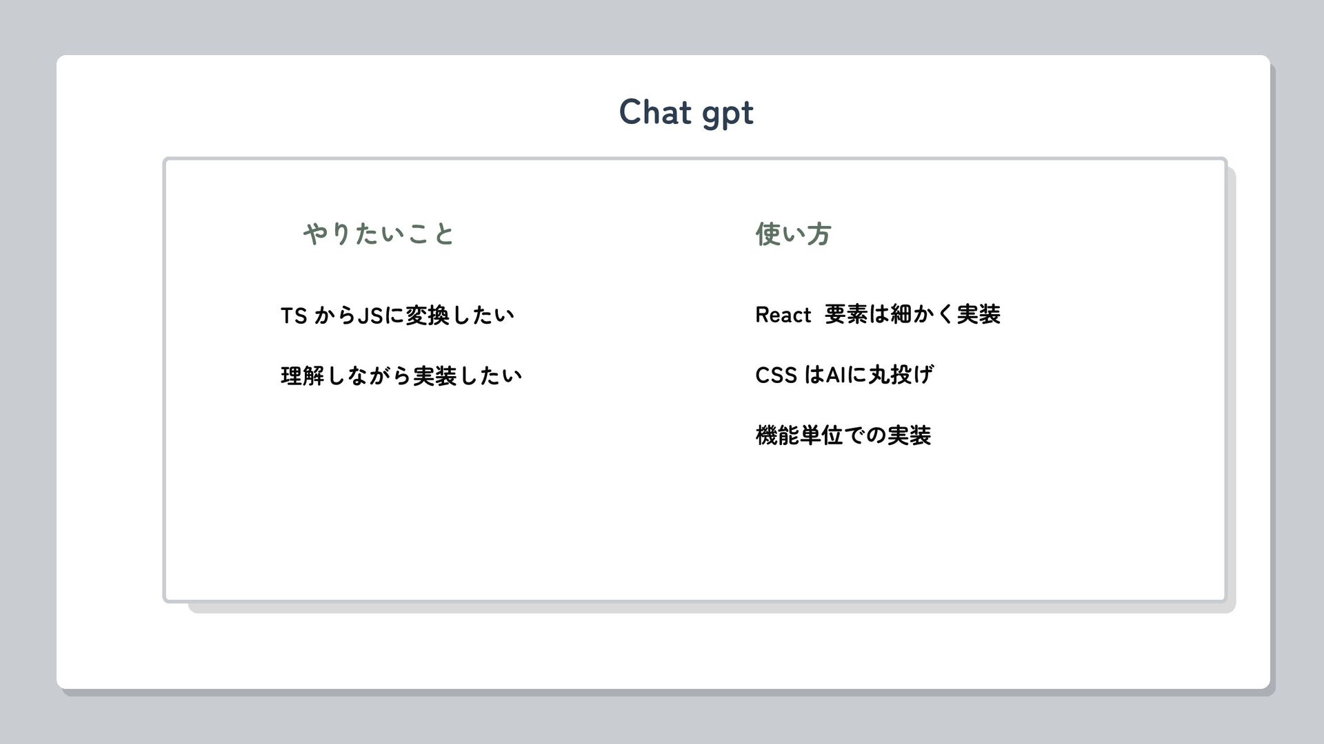 やりたいこと TS からJSに変換したい 理解しながら実装したい Chat gpt React 要素は細かく実装 CSS はAIに丸投げ