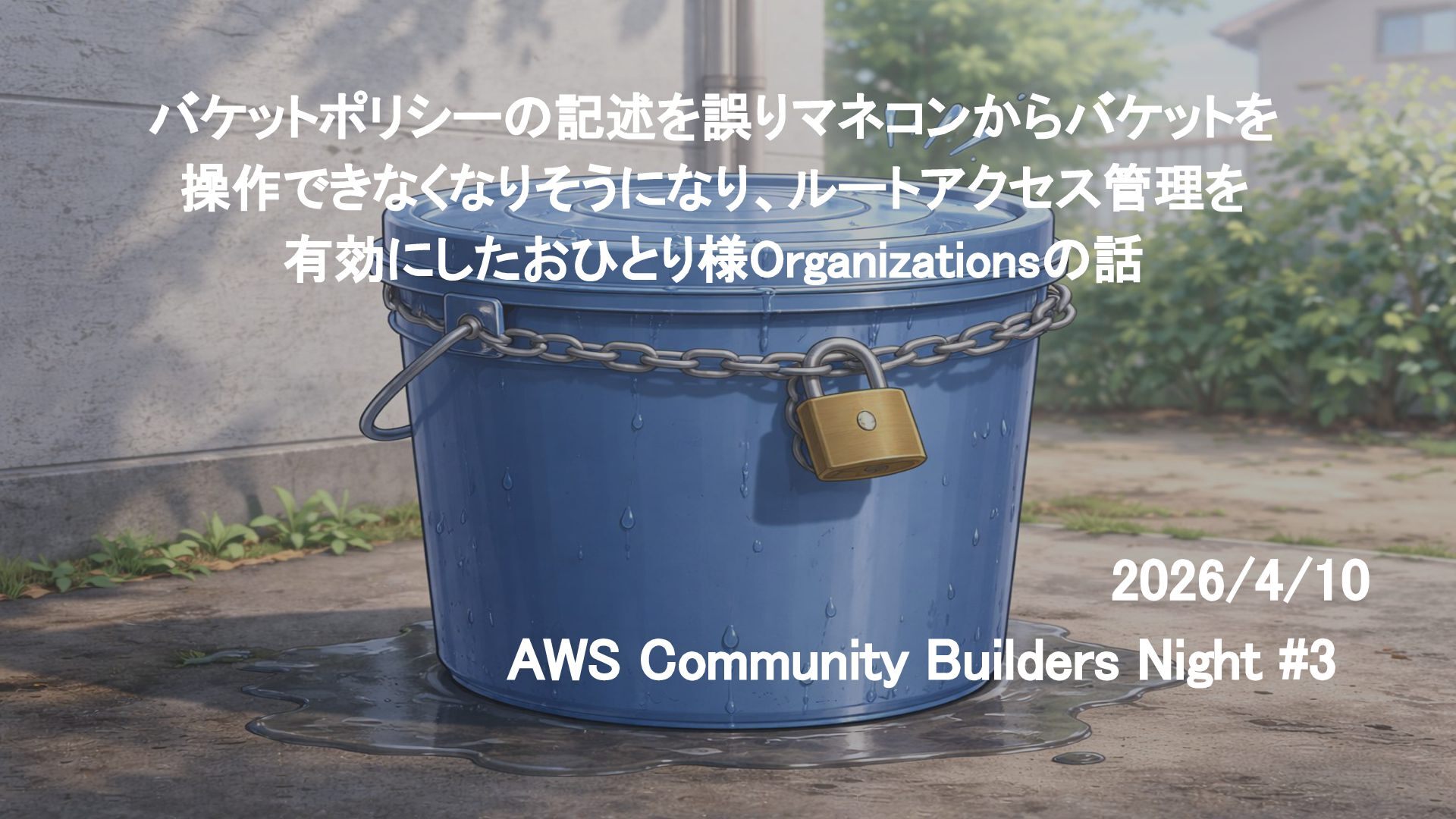 バケットポリシーの記述を誤りマネコンからバケットを 操作できなくなりそうになり、ルートアクセス管理を 有効にしたおひとり様Organizationsの話 2026/4/10 AWS Community Builders Night #3