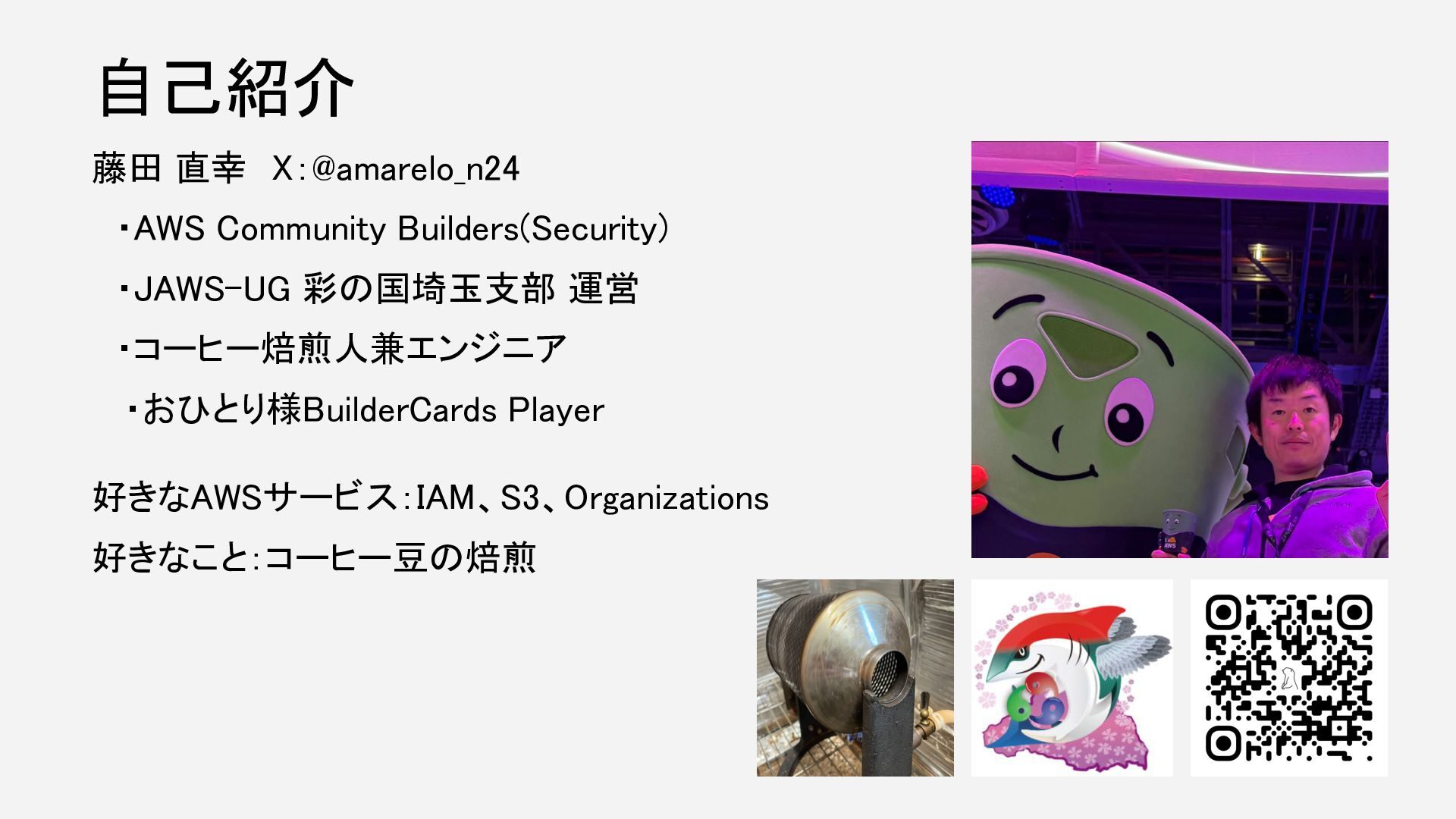 自己紹介 藤田 直幸 X:@amarelo_n24 ・AWS Community Builders(Security) ・JAWS-UG 彩の国埼玉支部 運営 ・コーヒー焙煎人兼エンジニア