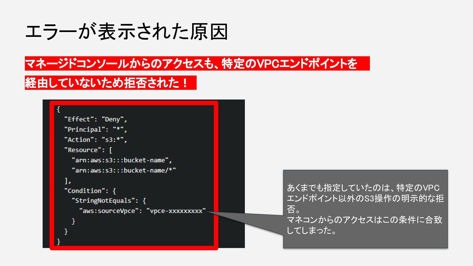 マネージドコンソールからのアクセスも、特定のVPCエンドポイントを 経由していないため拒否された! エラーが表示された原因 あくまでも指定していたのは、特定のVPC エンドポイント以外のS3操作の明示的な拒 否。 マネコンからのアクセスはこの条件に合致 してしまった。