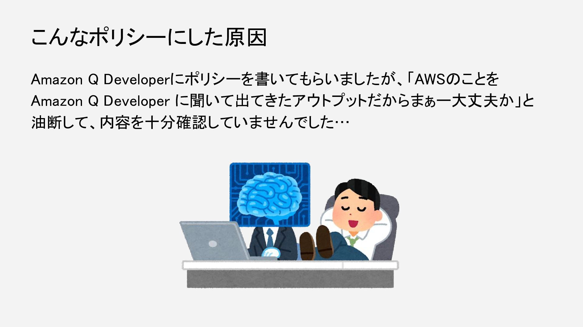 Amazon Q Developerにポリシーを書いてもらいましたが、「AWSのことを Amazon Q Developer に聞いて出てきたアウトプットだからまぁー大丈夫か」と 油断して、内容を十分確認していませんでした… こんなポリシーにした原因