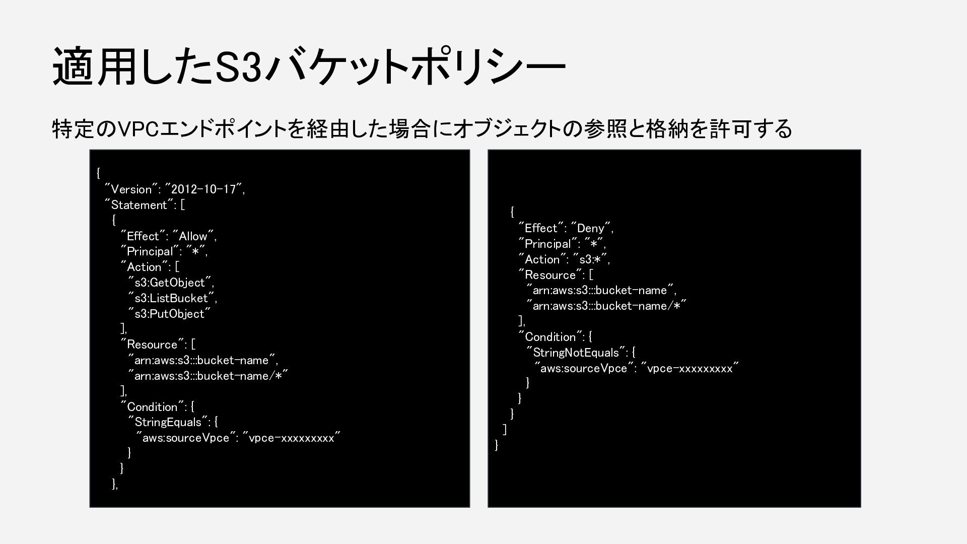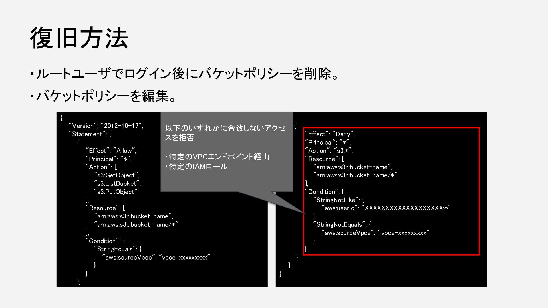"Action": [ "s3:GetObject", "s3:ListBucket", "s3:PutObject" ], "Resource": [ "arn:aws:s3:::bucket-name", "arn:aws:s3:::bucket-name/*" ], "Condition": { "StringEquals": { "aws:sourceVpce": "vpce-xxxxxxxxx" } } }, ・ルートユーザでログイン後にバケットポリシーを削除。 ・バケットポリシーを編集。 { "Effect": "Deny", "Principal": "*", "Action": "s3:*", "Resource": [ "arn:aws:s3:::bucket-name", "arn:aws:s3:::bucket-name/*" ], "Condition": { "StringNotLike": { "aws:userId": "XXXXXXXXXXXXXXXXXXX:*" }, "StringNotEquals": { "aws:sourceVpce": "vpce-xxxxxxxxx" } } } ] } 復旧方法 以下のいずれかに合致しないアクセ スを拒否 ・特定のVPCエンドポイント経由 ・特定のIAMロール