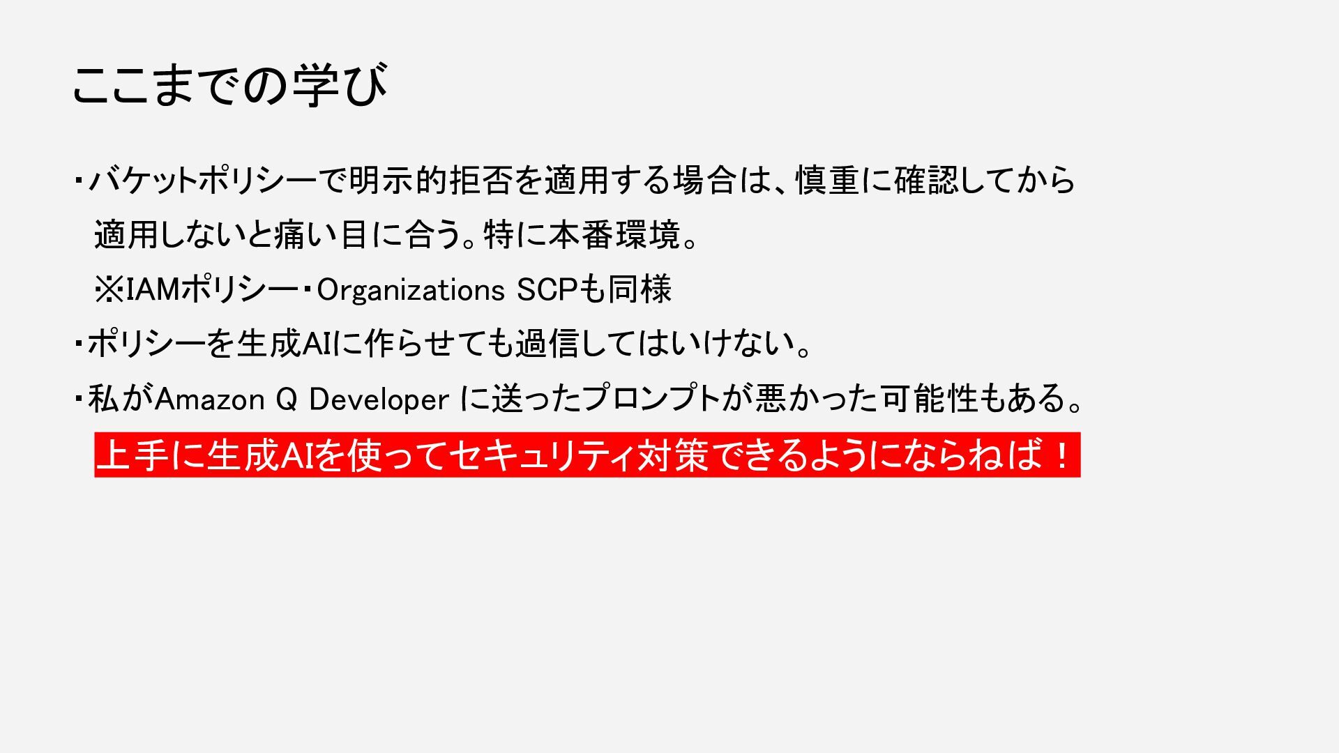 ・バケットポリシーで明示的拒否を適用する場合は、慎重に確認してから 適用しないと痛い目に合う。特に本番環境。 ※IAMポリシー・Organizations SCPも同様 ・ポリシーを生成AIに作らせても過信してはいけない。 ・私がAmazon Q Developer に送ったプロンプトが悪かった可能性もある。 上手に生成AIを使ってセキュリティ対策できるようにならねば!
