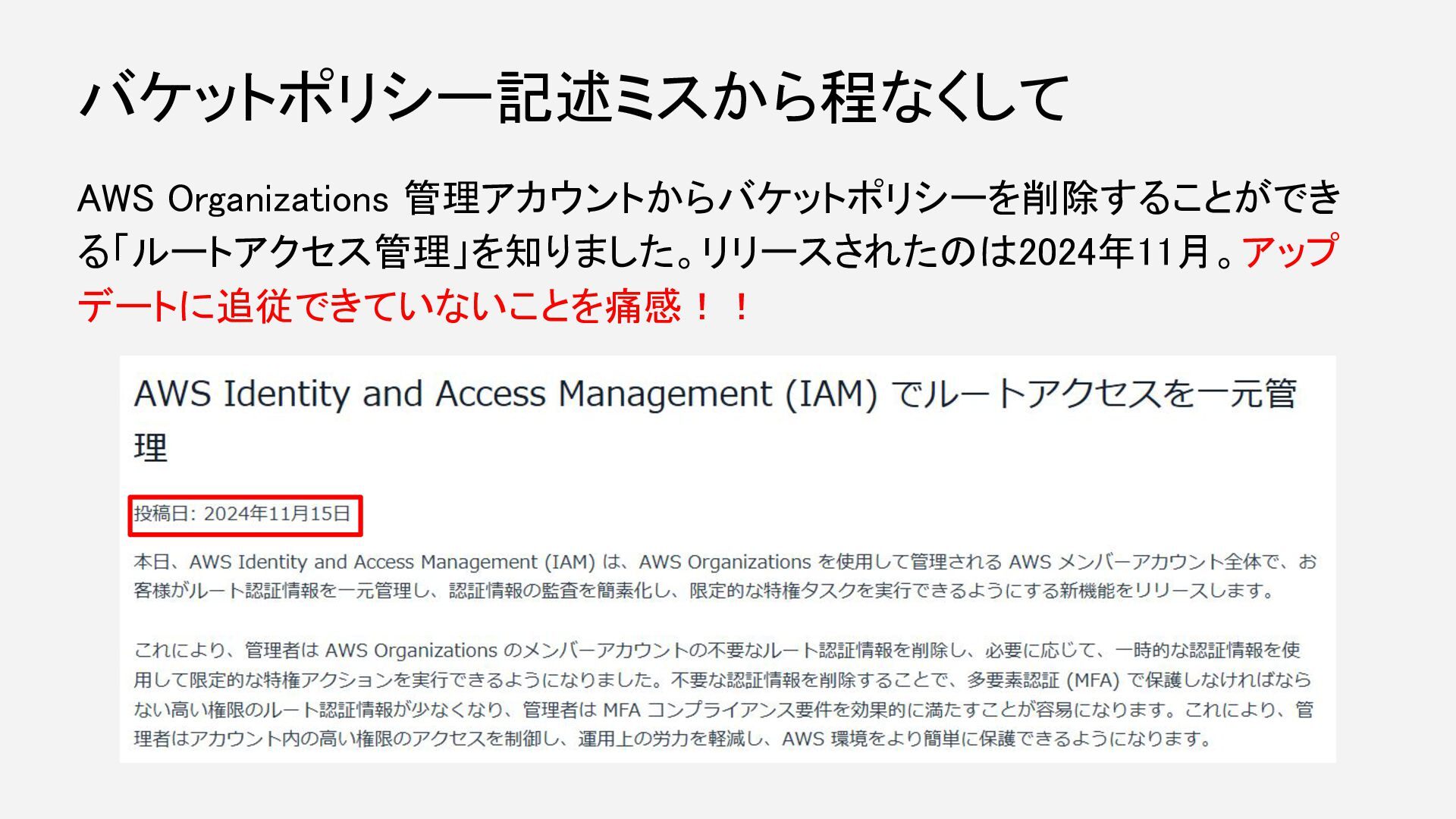 AWS Organizations 管理アカウントからバケットポリシーを削除することができ る「ルートアクセス管理」を知りました。リリースされたのは2024年11月。アップ デートに追従できていないことを痛感!! バケットポリシー記述ミスから程なくして