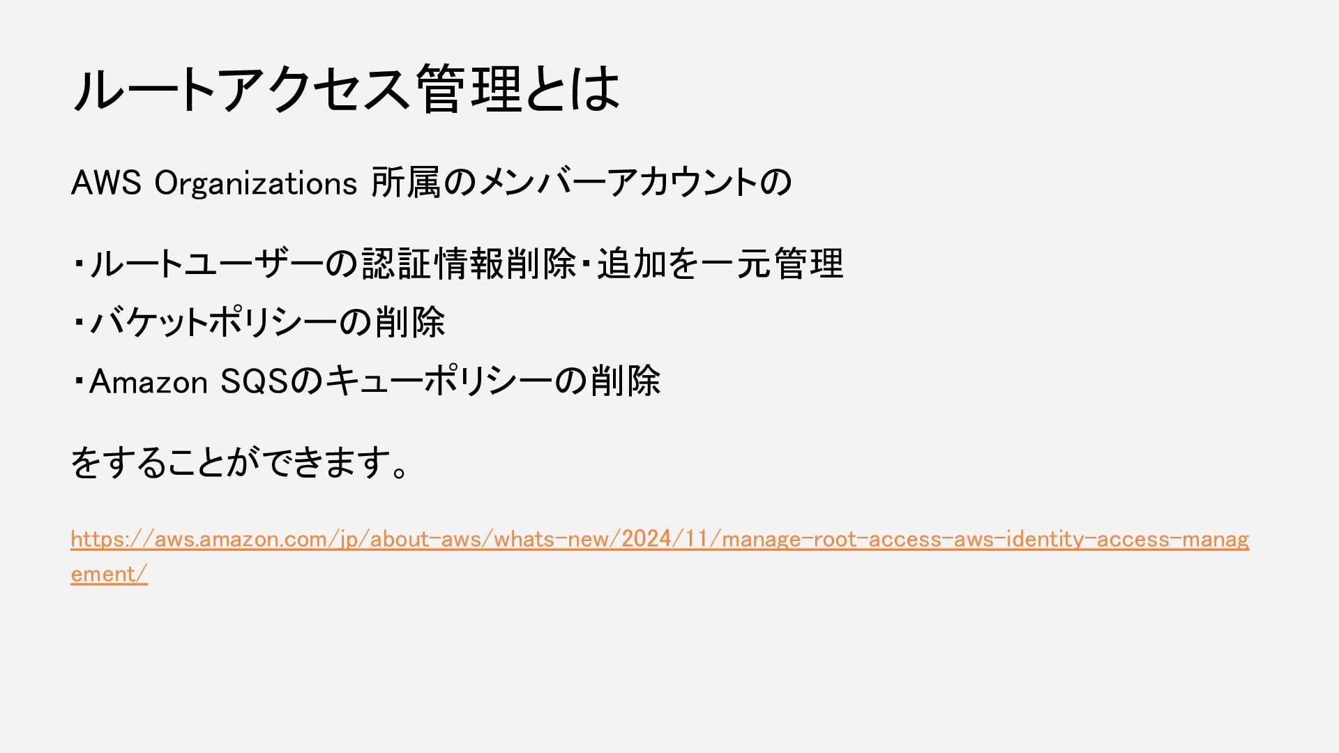 AWS Organizations 所属のメンバーアカウントの ・ルートユーザーの認証情報削除・追加を一元管理 ・バケットポリシーの削除 ・Amazon SQSのキューポリシーの削除 をすることができます。 https://aws.amazon.com/jp/about-aws/whats-new/2024/11/manage-root-access-aws-identity-access-manag ement/