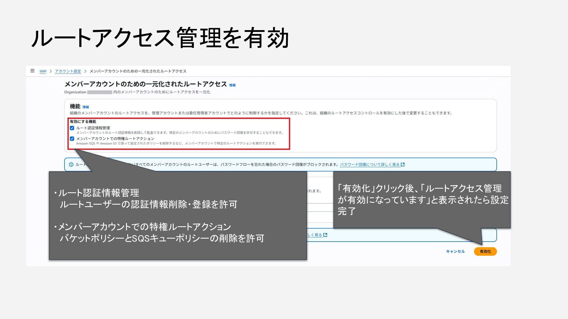 ルートアクセス管理を有効 ・ルート認証情報管理 ルートユーザーの認証情報削除・登録を許可 ・メンバーアカウントでの特権ルートアクション バケットポリシーとSQSキューポリシーの削除を許可 「有効化」クリック後、「ルートアクセス管理 が有効になっています」と表示されたら設定 完了