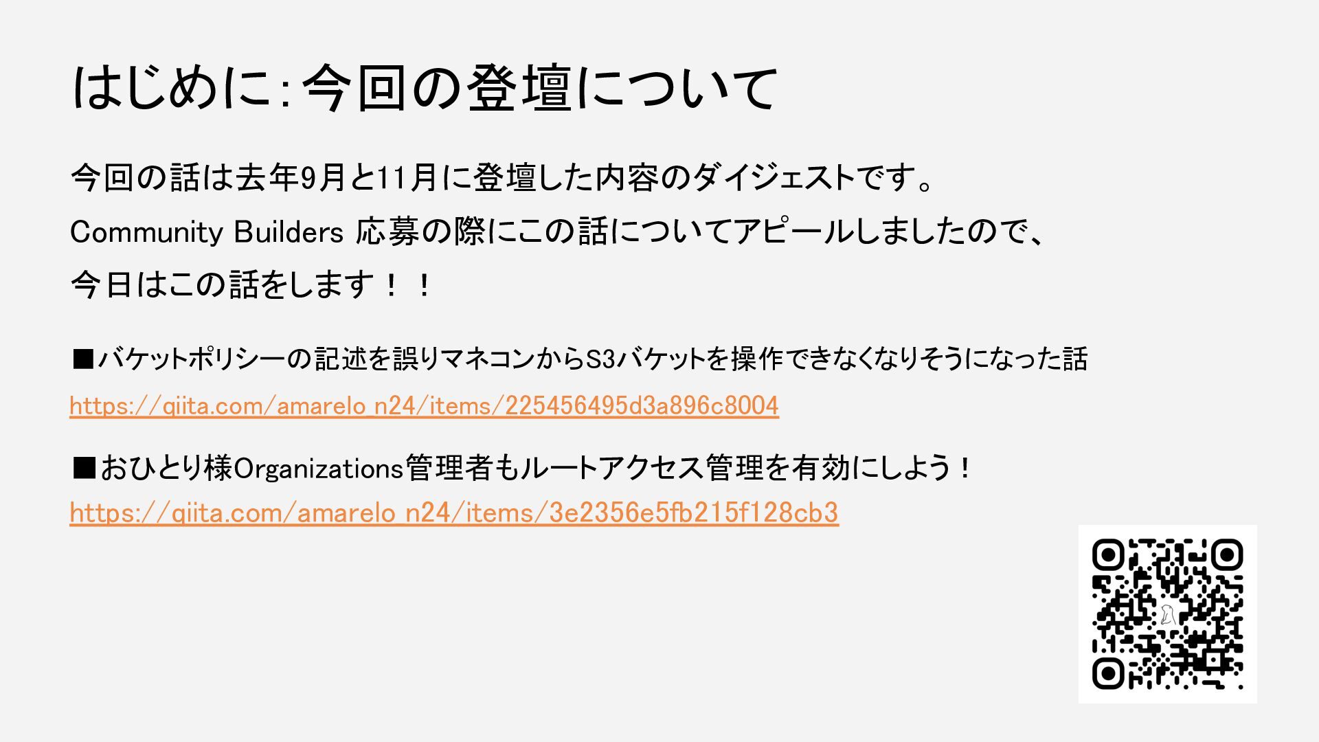 今回の話は去年9月と11月に登壇した内容のダイジェストです。 Community Builders 応募の際にこの話についてアピールしましたので、 今日はこの話をします!! ▪バケットポリシーの記述を誤りマネコンからS3バケットを操作できなくなりそうになった話 https://qiita.com/amarelo_n24/items/225456495d3a896c8004 ▪おひとり様Organizations管理者もルートアクセス管理を有効にしよう! https://qiita.com/amarelo_n24/items/3e2356e5fb215f128cb3 はじめに:今回の登壇について