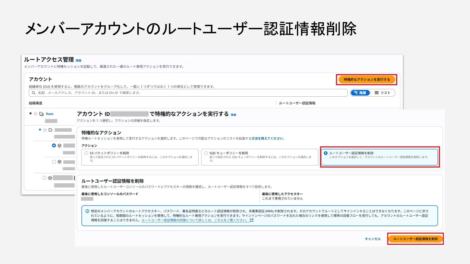 メンバーアカウントのルートユーザー認証情報削除